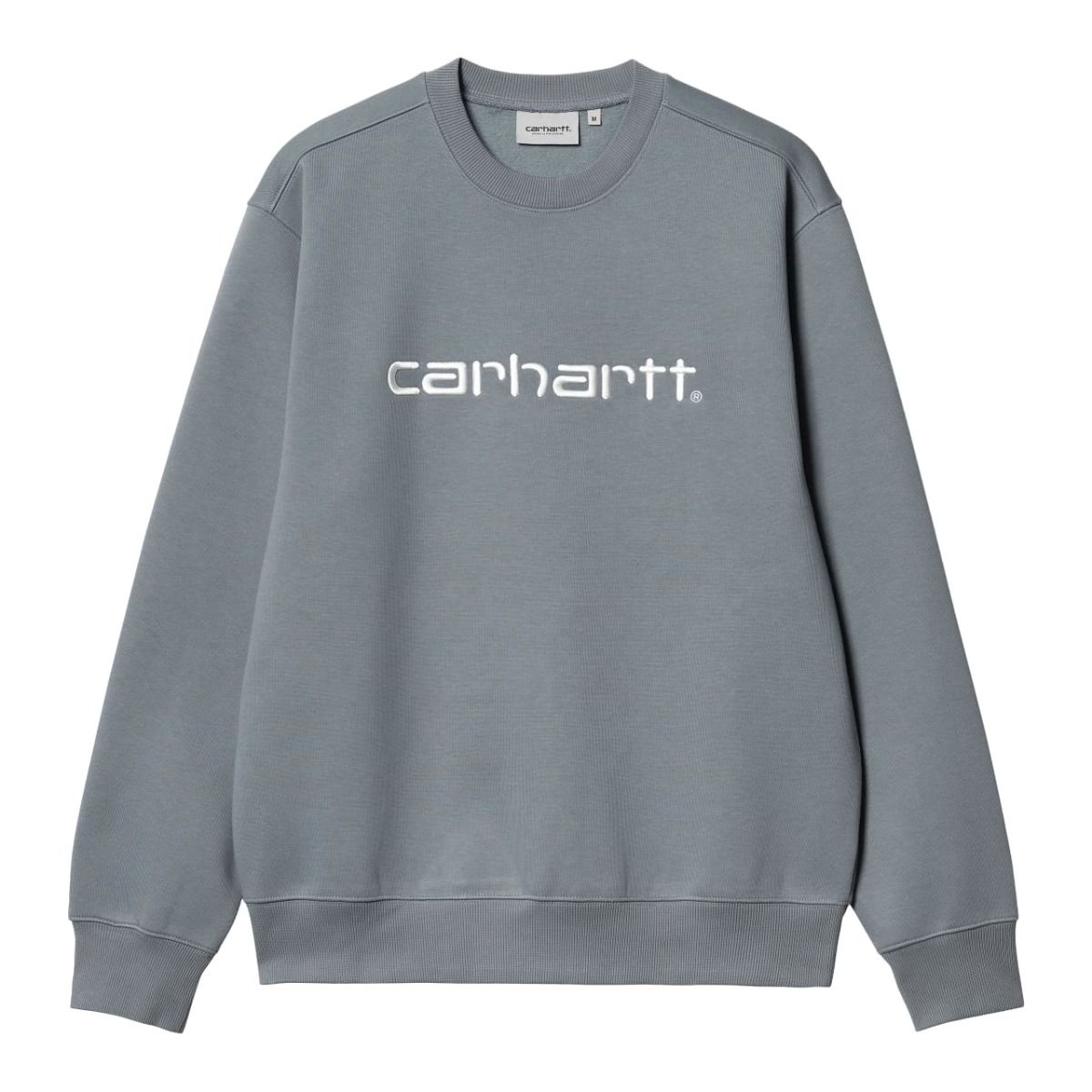 Esta cómoda sudadera básica gris de ajuste holgado cuenta con tejido cepillado para proporcionar un aspecto de forro polar, cuello redondo, puños y cintura acanalados, junto con el logo de Carhartt en texto bordado en color blanco cera en el pecho.