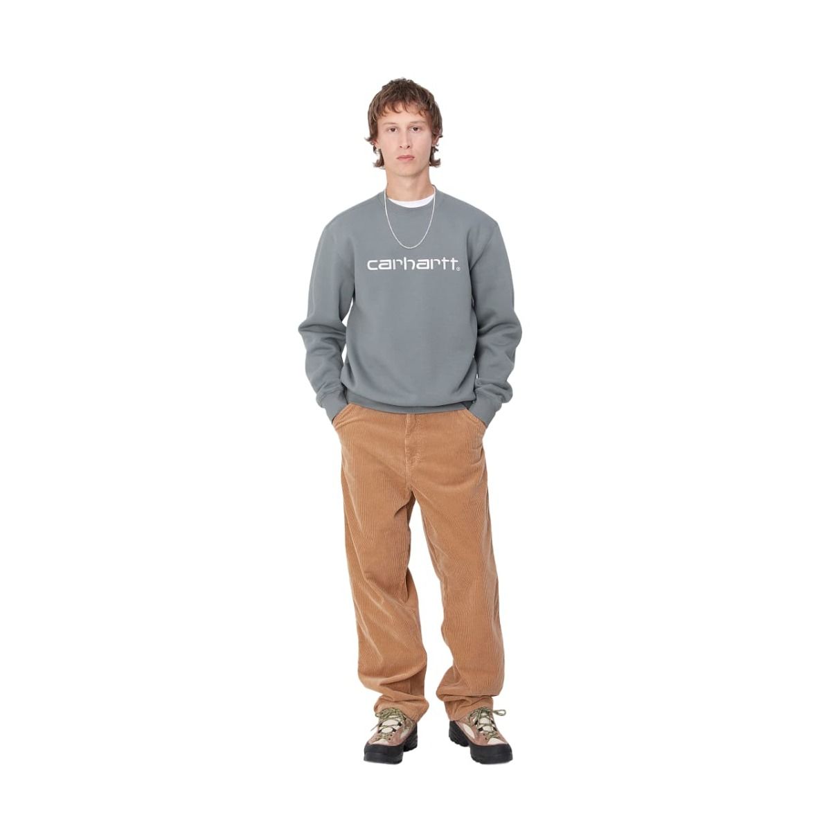La sudadera para hombre Carhartt Sweatshirt en tono gris paloma con el logo bordado en blanco cera (Dove Grey-Wax) de Carhartt WIP está confeccionada con tejido de punto en mezcla de 58% algodón y 42% poliéster pesado (440g/sqm).