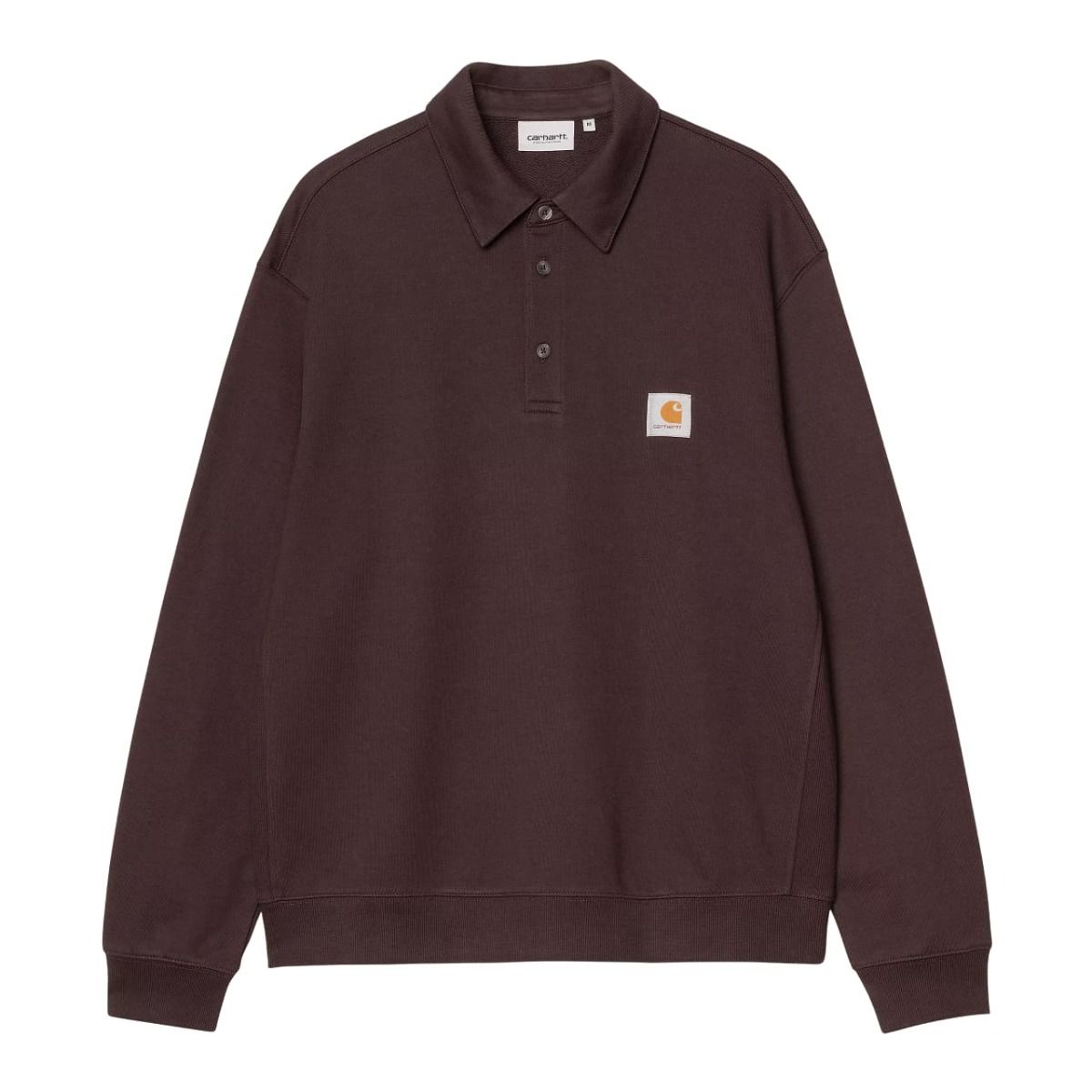 Sudadera polo marrón Carhartt WIP en algodón grueso con corte holgado. Perfecta para un look urbano con personalidad.