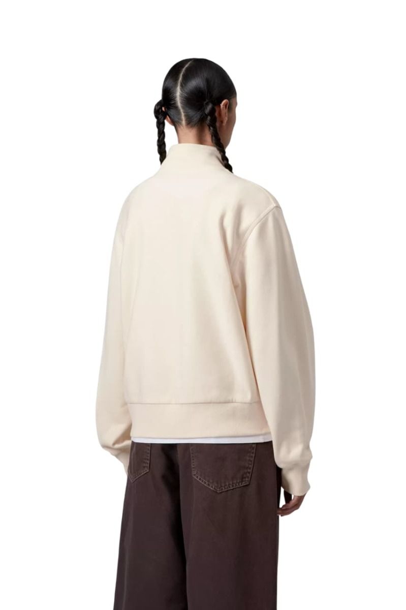 Sudadera Carhartt WIP para mujer con cuello alto, corte boxy y forro interior tipo polar. Logo American Script bordado y media cremallera frontal. Color beige natural.