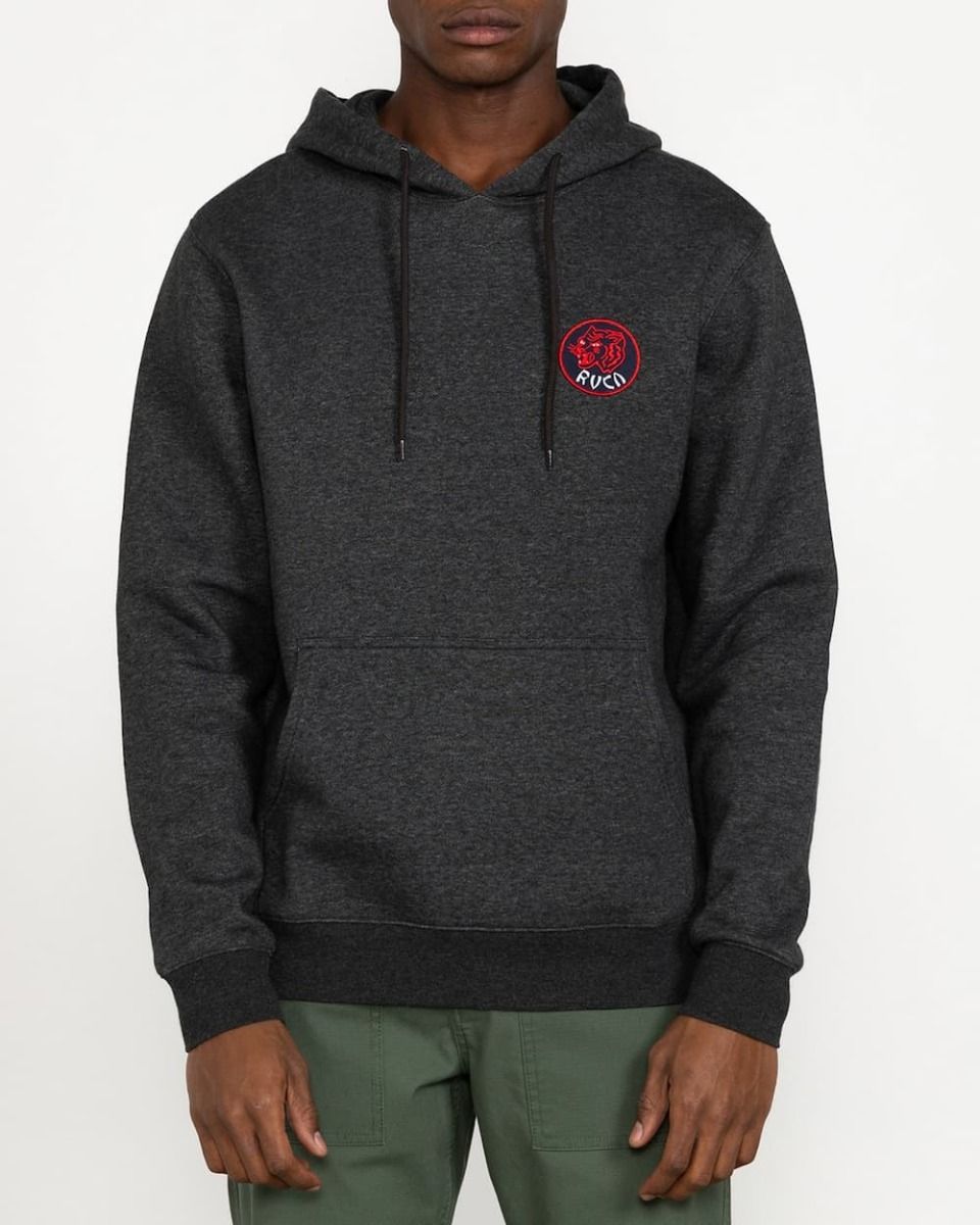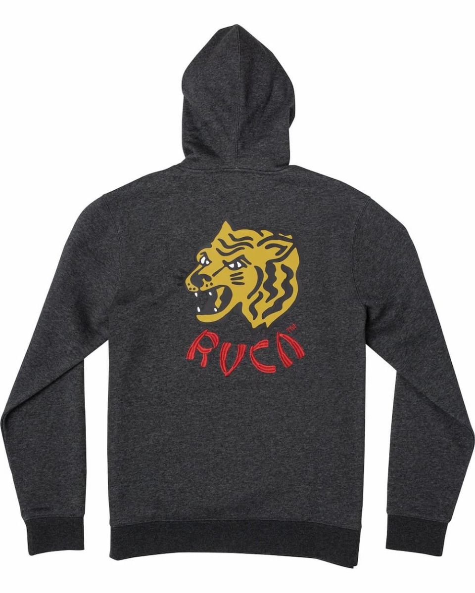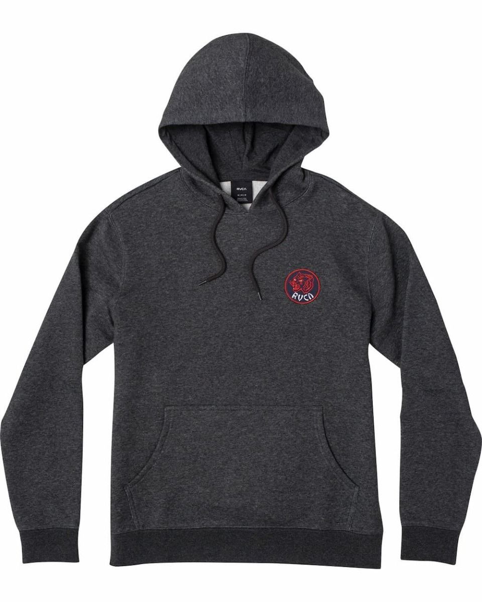 Cuenta con capucha con cordón ajustable, amplio bolsillo tipo canguro, puños y cintura con ribetes acanalados, un parche de tela en el pecho con el logo de Rvca y un estampado original Rvca en la espalda.