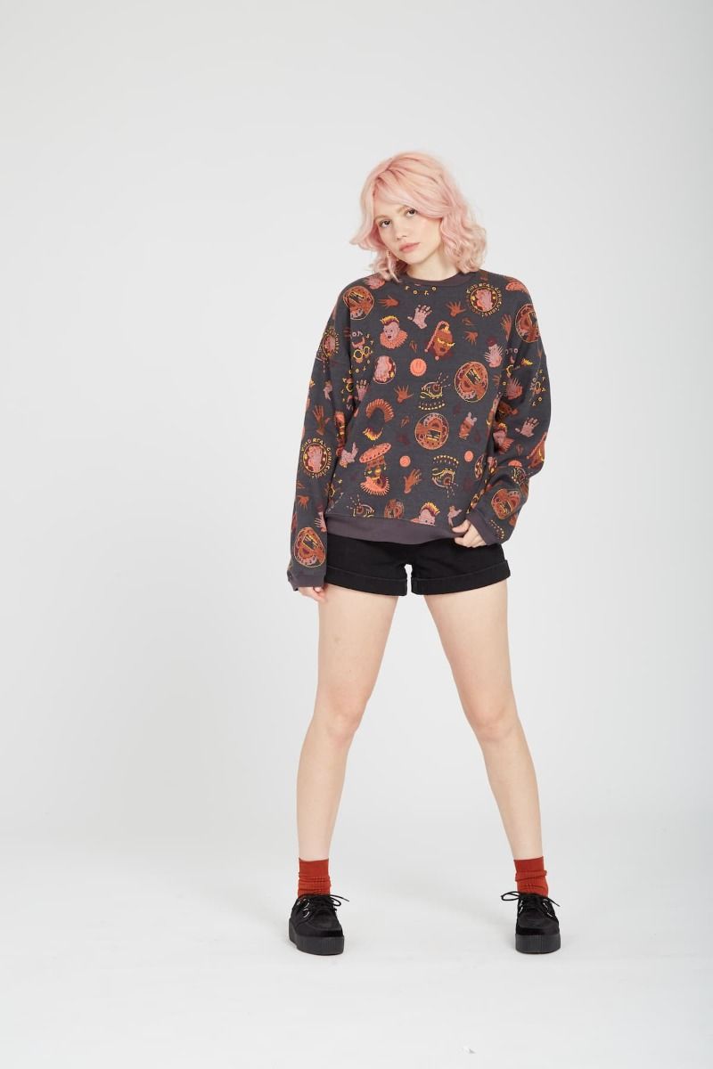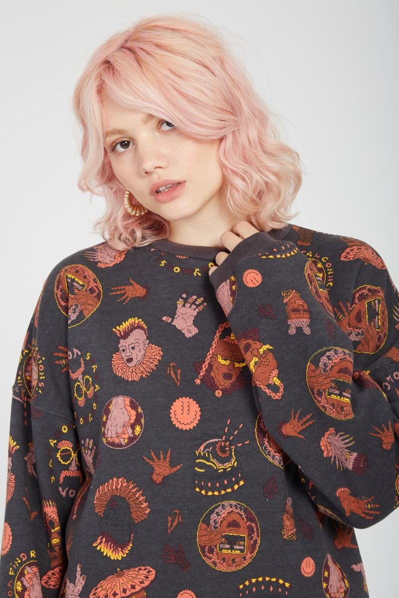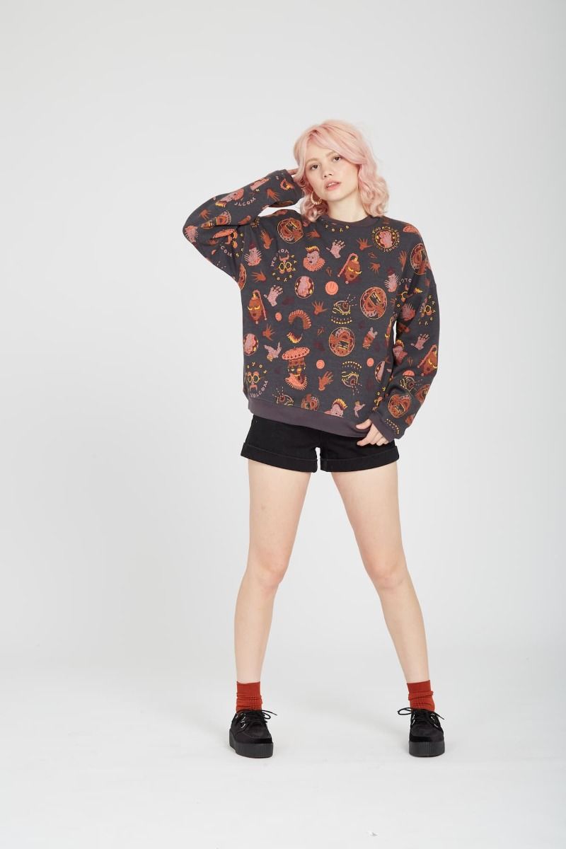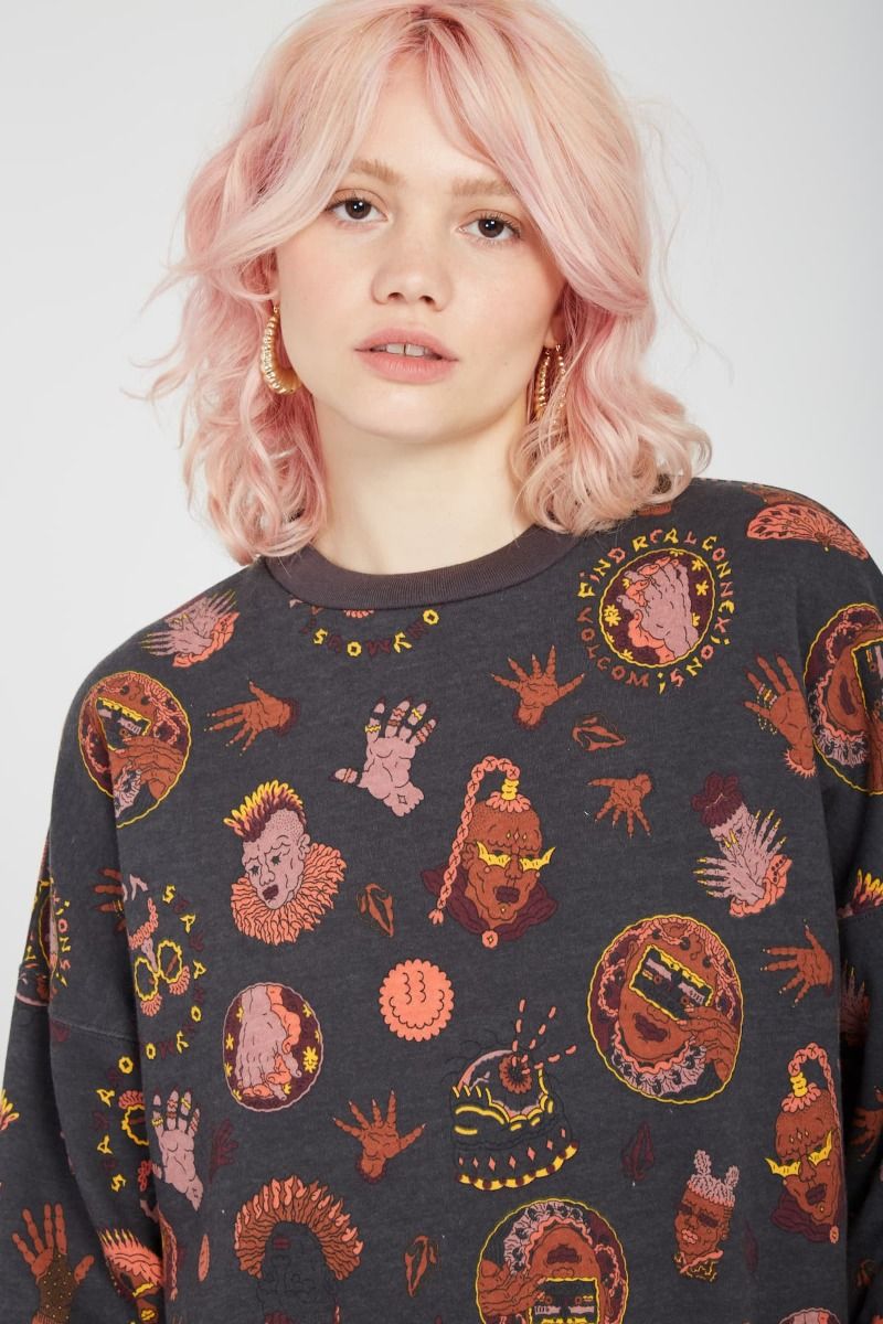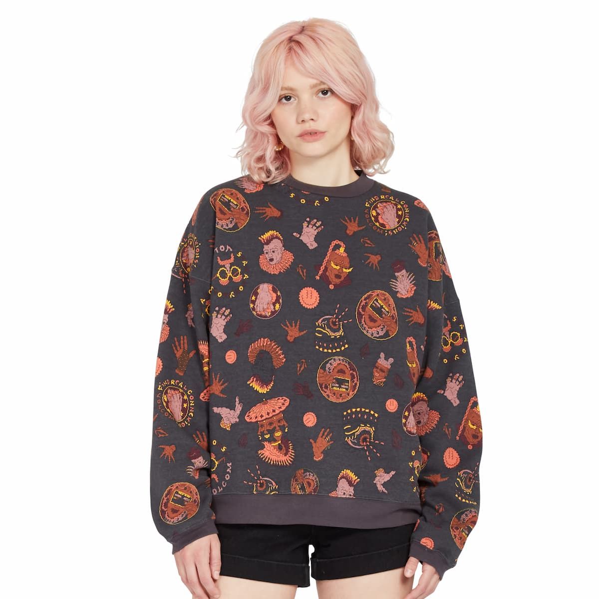 Este crew de corte oversize, perteneciente a la Colección Connected Minds de Volcom, cuenta con cuello redondo, hombros caídos, puños y dobladillo inferior acanalados, junto con un estampado en toda la prenda con detalles la colección.