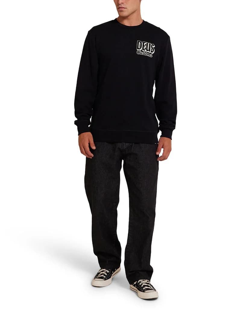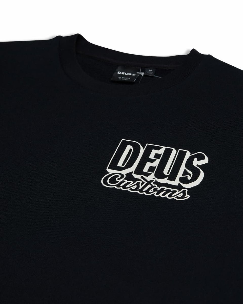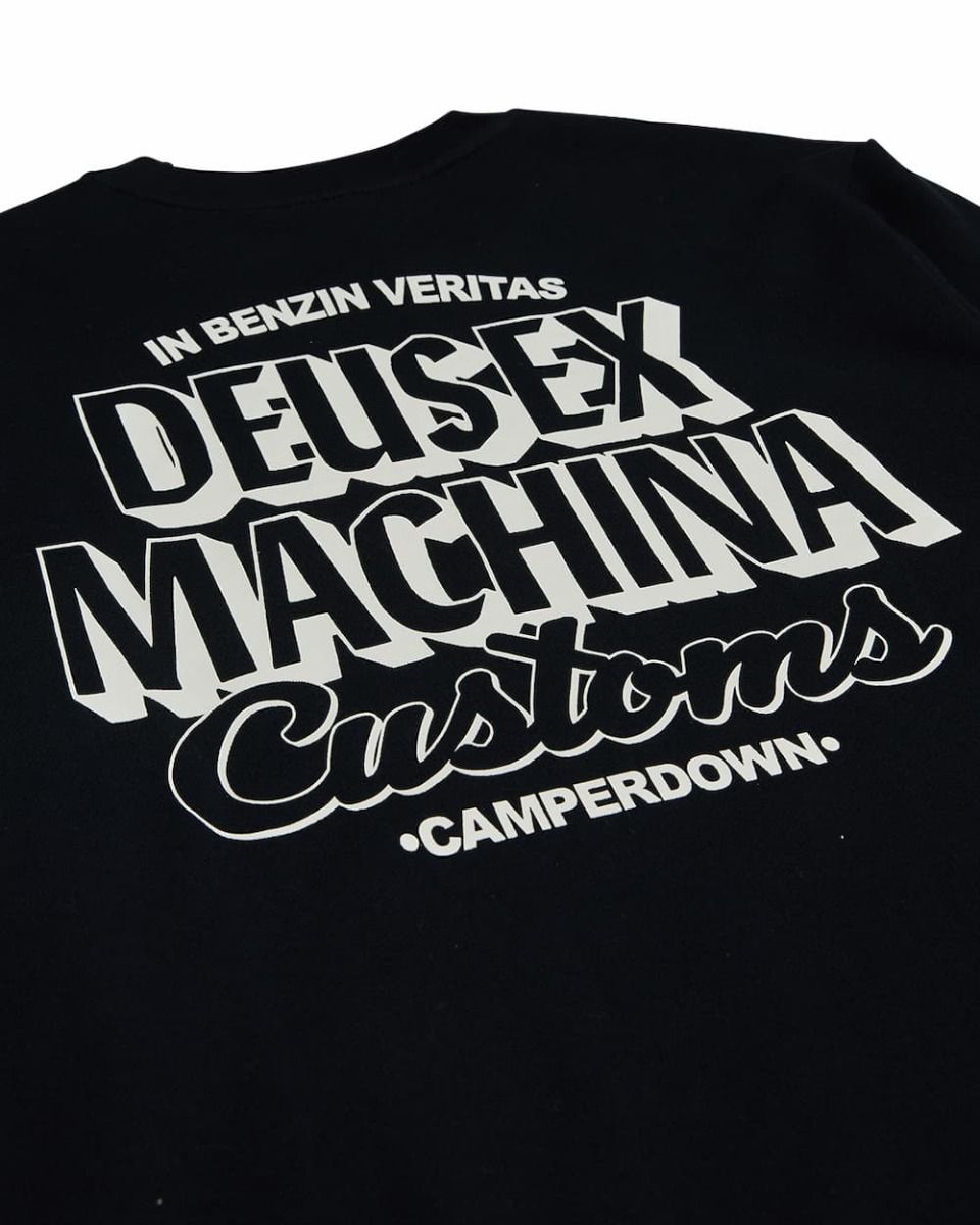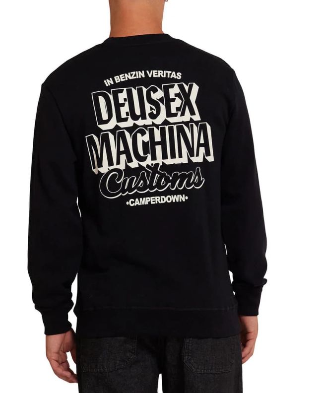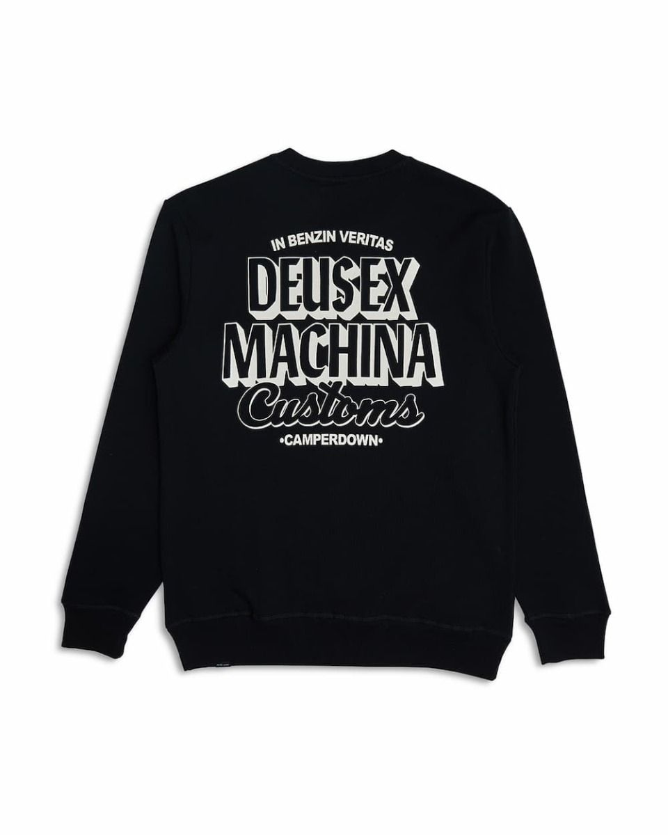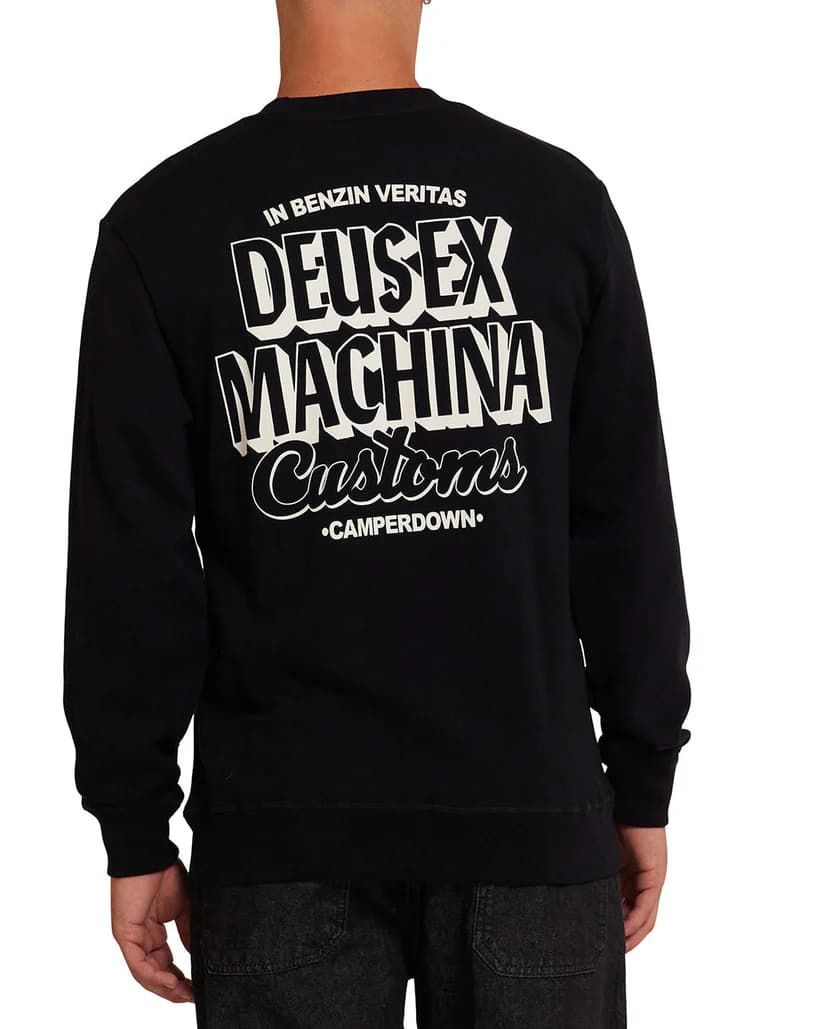 Este crew de corte regular cuenta con cuello redondo, forro polar interior cepillado, puños y bajo ribeteados, serigrafiado "Deus Customs" en la parte delantera izquierda, junto con la inscripción "In Benzin Veritas - Deus Ex Machina Customs - Camperdown" impresa en la zona posterior.