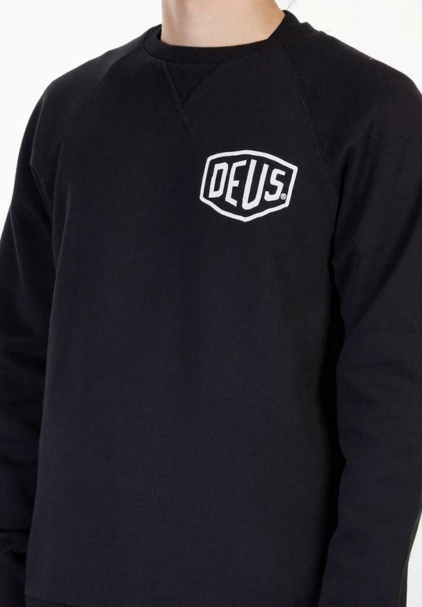 Este crew raglán negro de ajuste regular, perteneciente a la Colección Deus Ex Machina Classics, cuenta con cuello redondo, forro polar cepillado 32/2s + 12/1s de 350 g de algodón, dobladillo inferior y puños acanalados, el logo DEUS estampado en el lado izquierdo del pecho y la leyenda "Deus Ex Machina. Ibiza. Carretera de Santa Eularia, Km 2, 07819 Ibiza” impresa en blanco en la espalda.