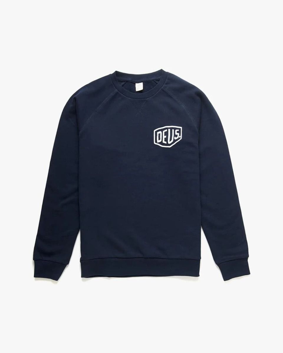 La sudadera sin capucha para hombre Ibiza Address Crew en tono azul marino (Navy) de Deus Ex Machina está fabricada con 100% algodón.