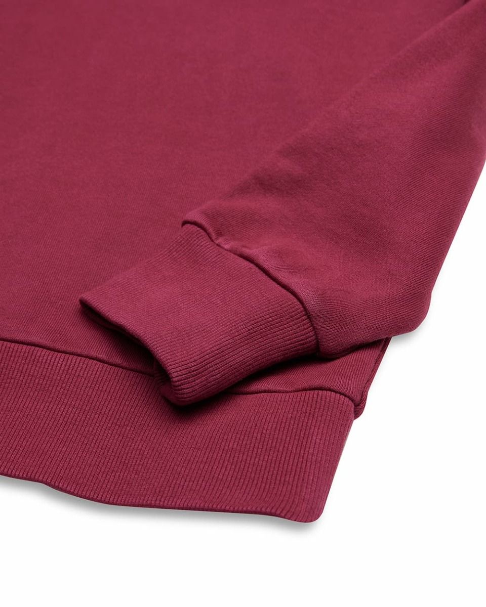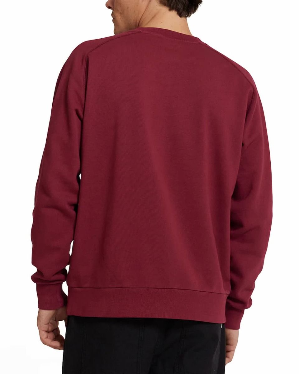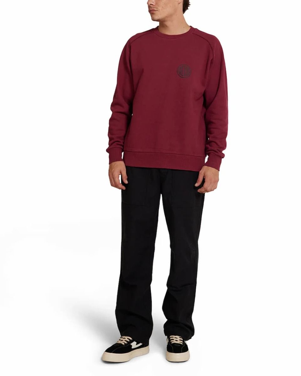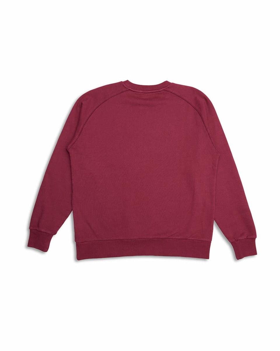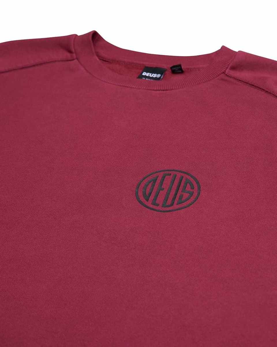 Este crew raglán granate de corte cuadrado (box fit), perteneciente a la Colección Deus Ex Machina Classics, cuenta con cuello redondo, forro polar interior cepillado, puños y bajo ribeteados, junto con el logo DEUS circular serigrafiado en la parte delantera izquierda.