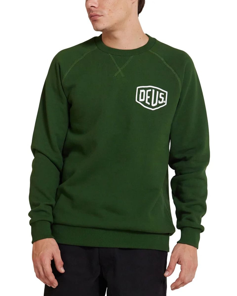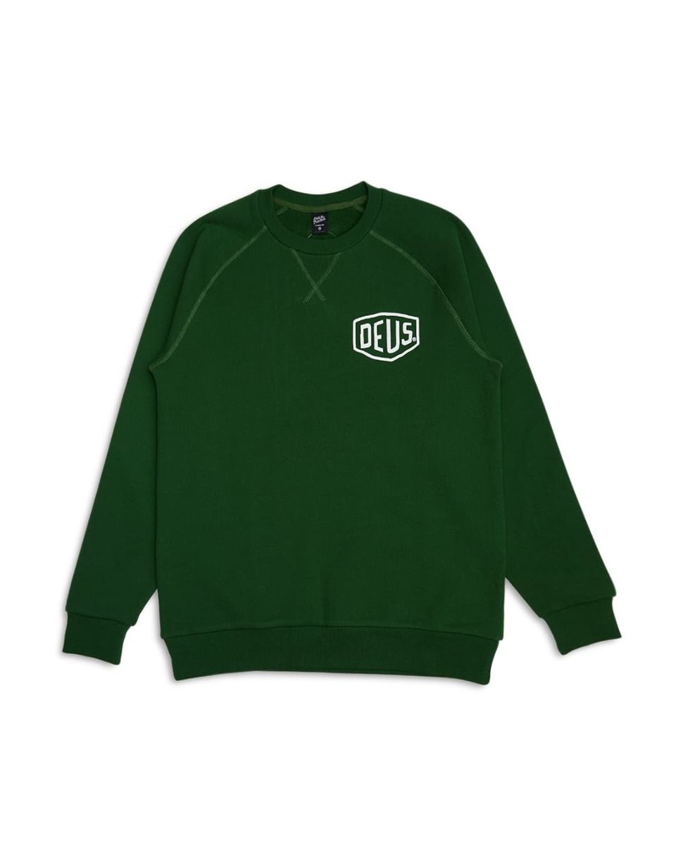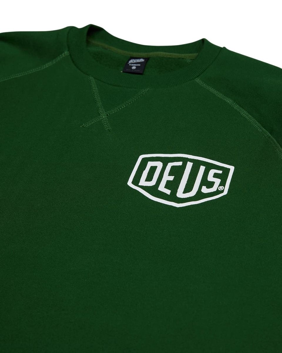 Este crew raglán verde de corte estándar, perteneciente a la Colección Deus Ex Machina Classics, cuenta con cuello redondo, forro polar interior cepillado, puños y bajo ribeteados, el logo Shield de DEUS serigrafiado en la parte delantera izquierda y la inscripción “Deus Ex Machina Tokyo. Mukojima 1-2-8 Asakusa” impresa en la espalda.