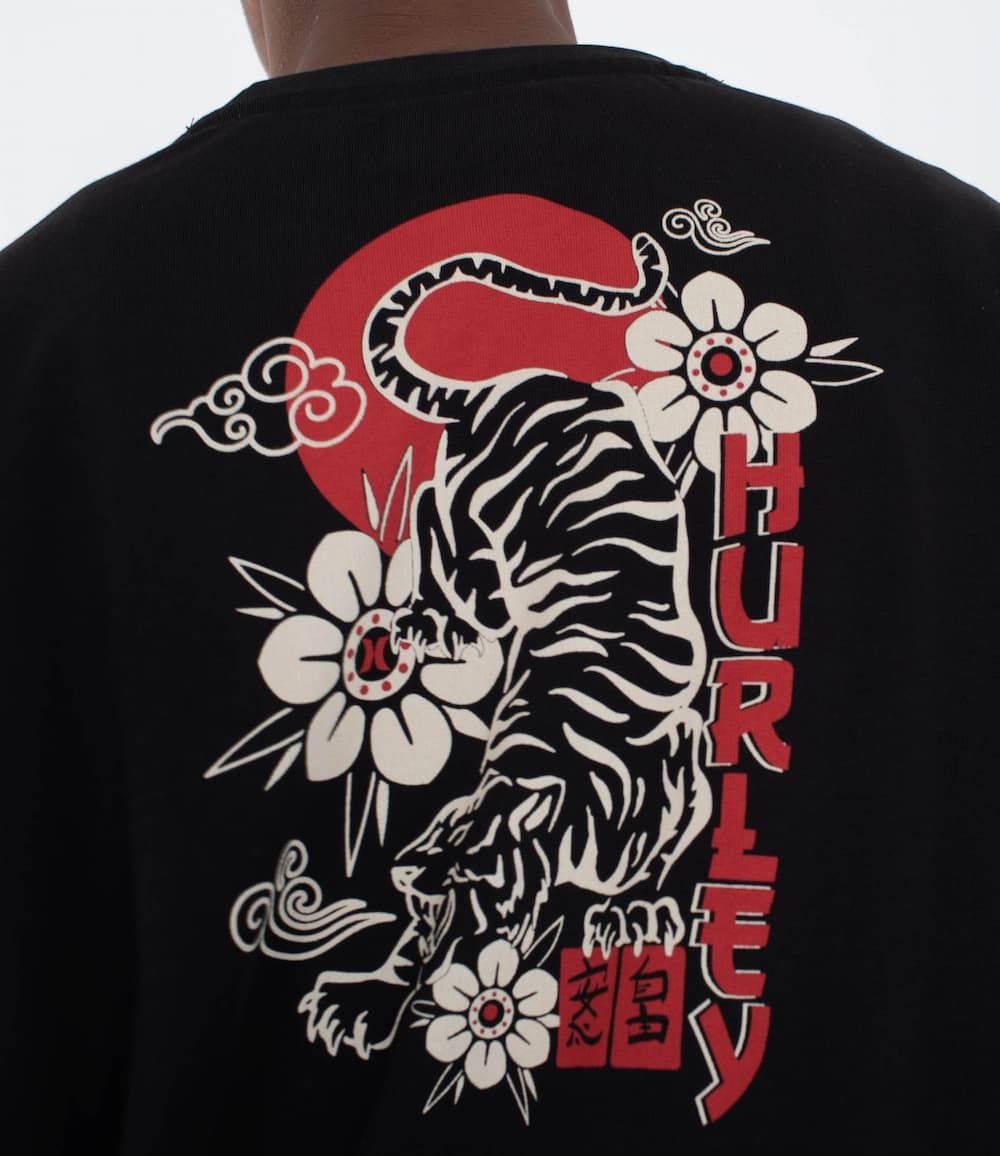 El protagonista absoluto es el gráfico trasero estilo tatuaje con tigre, flores y tipografía vertical Hurley en rojo, acompañado de nubes y detalles inspirados en el imaginario del tattoo tradicional. Una declaración visual de fuerza, arte y libertad personal.