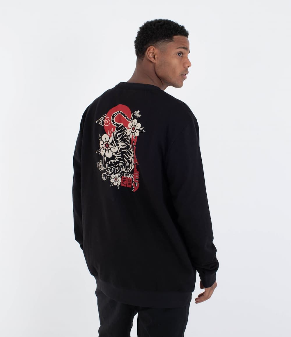 La Hurley Tattoo Crew negra forma parte de una colección que transforma el arte del tatuaje americano en diseño textil con carácter. Esta sudadera para hombre destaca por su estampado trasero con tigre y flores, detalles en rojo y un gráfico que captura el espíritu rebelde y creativo de la cultura tattoo old school.