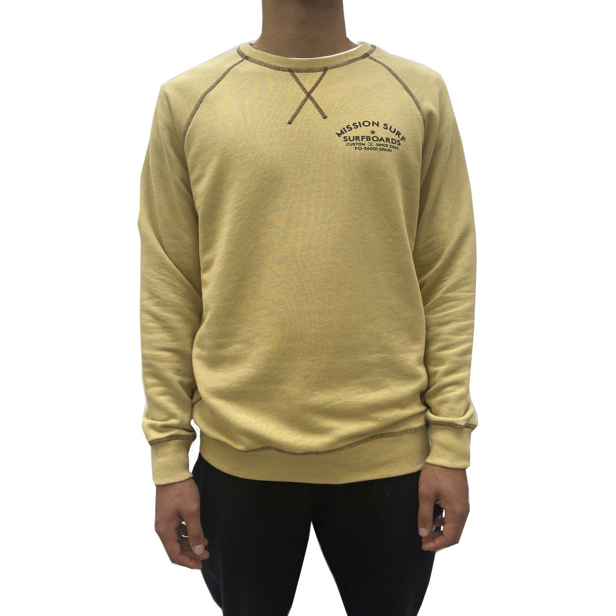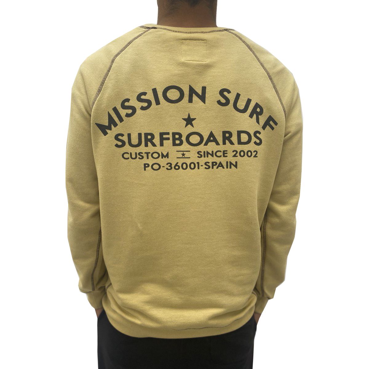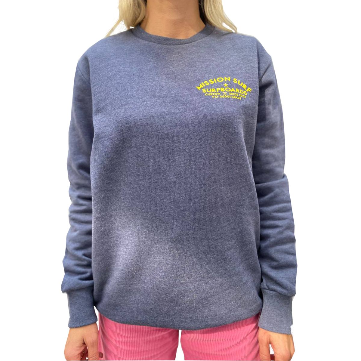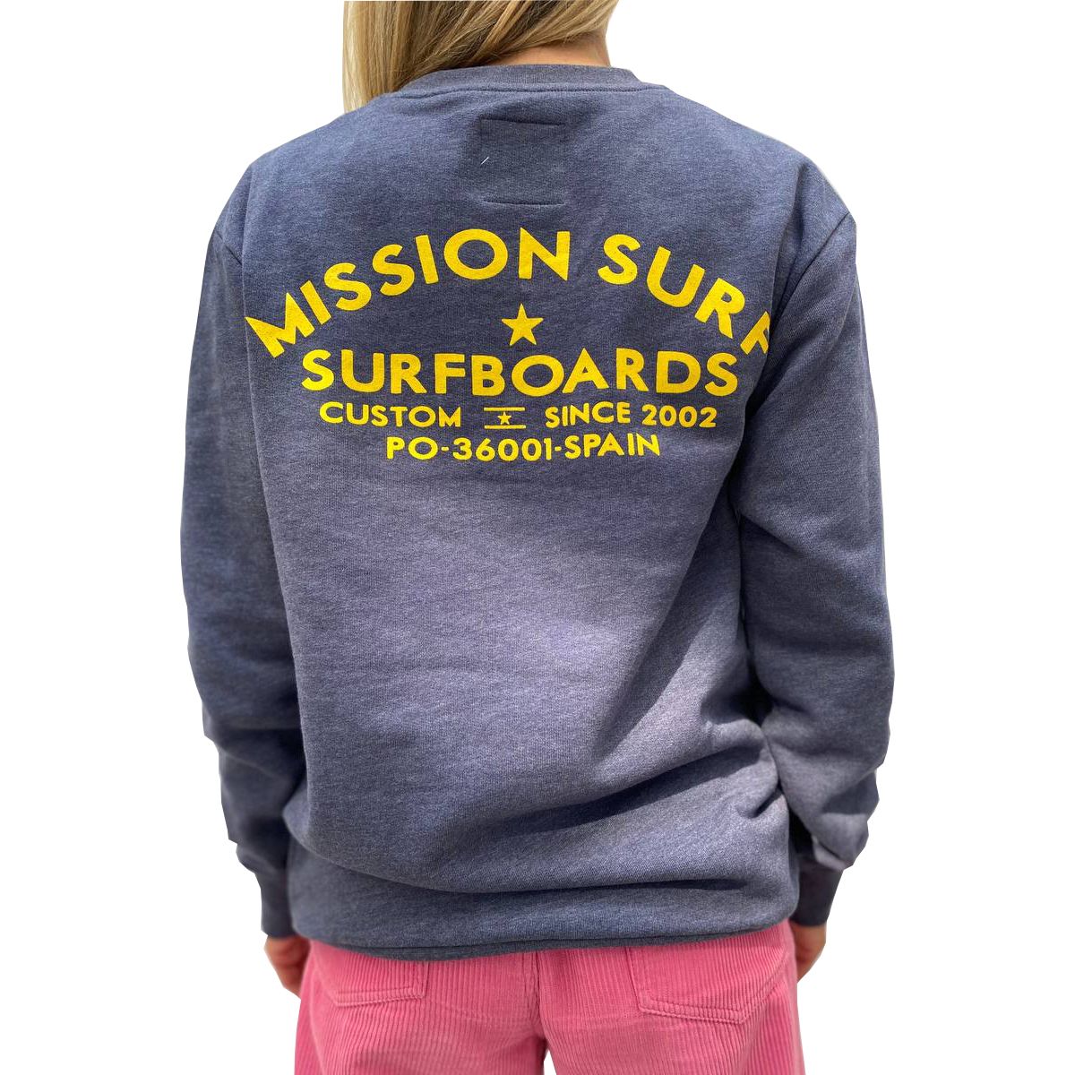 Esta sudadera de corte regular cuenta con cuello redondo, el logo de Mission estampado en el pecho y la leyenda "Mission Surf Surfboards Custom Since 2002 PO-36001-Spain" serigrafiada en la espalda.