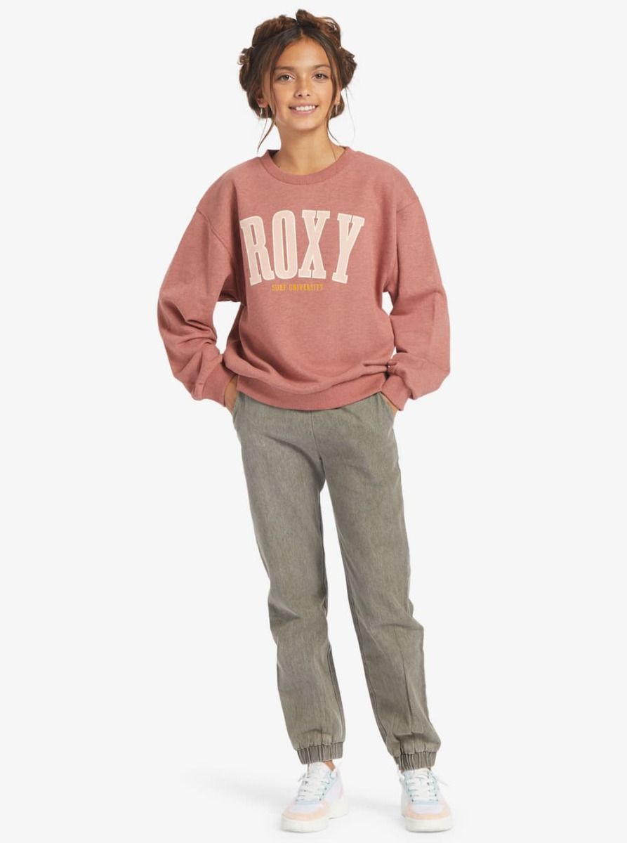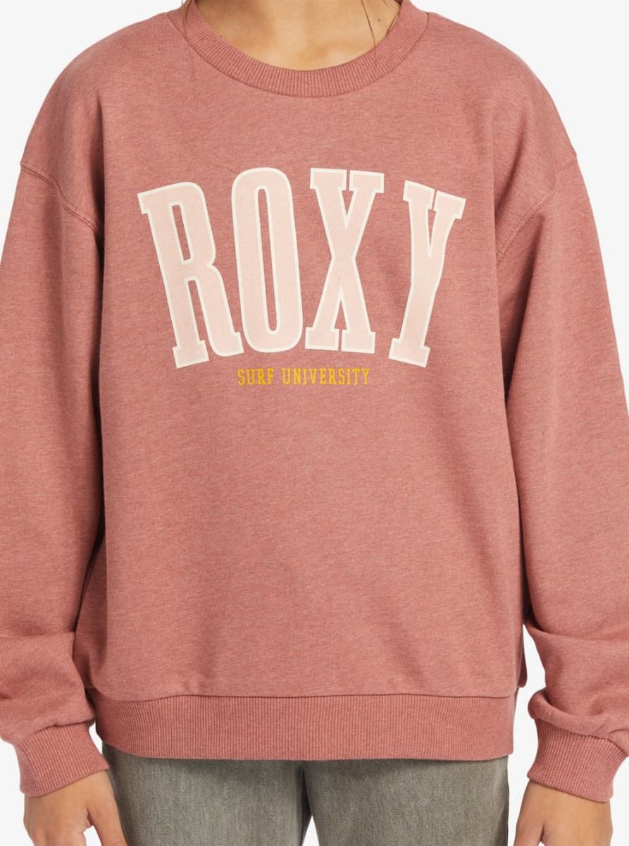 Este crew juvenil de corte extra-grande cuenta con cuello redondo en punto canalé, puños y dobladillo inferior acanalados y serigrafiado estilo universidad "Roxy Surf University" en la parte delantera.