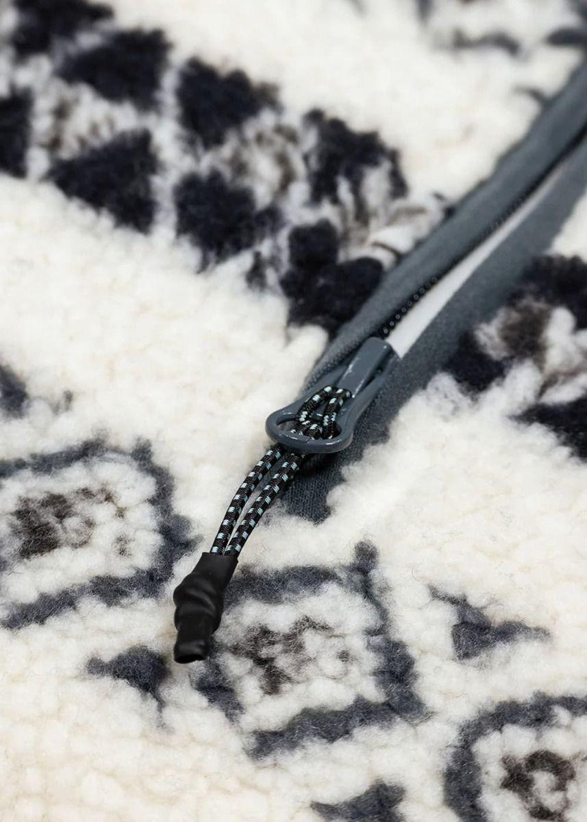 Esta sudadera destaca por su tejido sherpa y polar reciclado, con un patrón jacquard que combina lo retro y lo técnico en una prenda robusta pero agradable al tacto. La media cremallera permite ponértela y quitártela fácilmente, y sus dos bolsillos laterales son perfectos para calentar las manos o guardar básicos.
