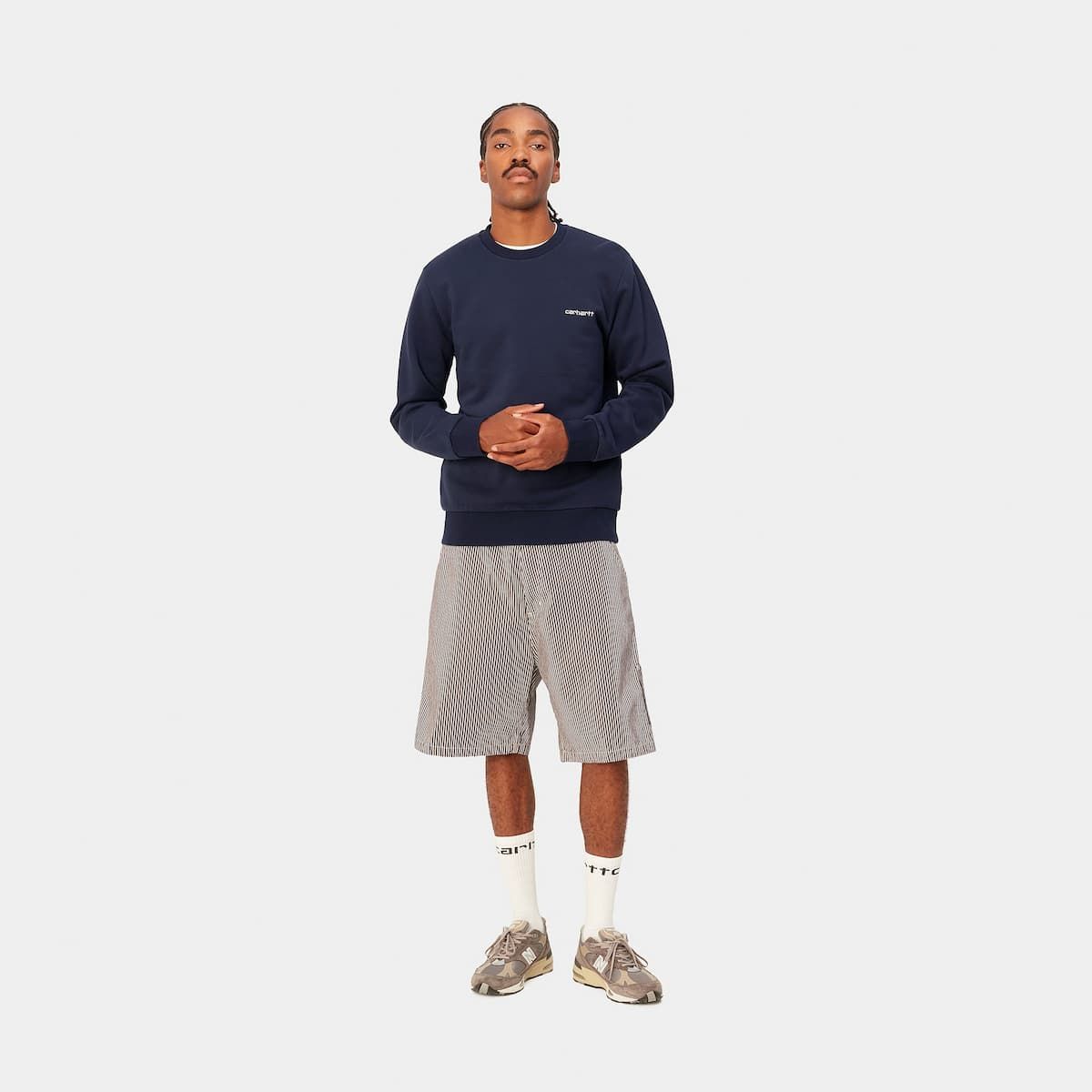 La sudadera para hombre Script Embroidery Sweat en tono azul con el logo en blanco (Blue-White) de Carhartt WIP está fabricada con 100% tejido de punto de algodón pesado cepillado (350g/m2) para una sensación de suave forro polar.