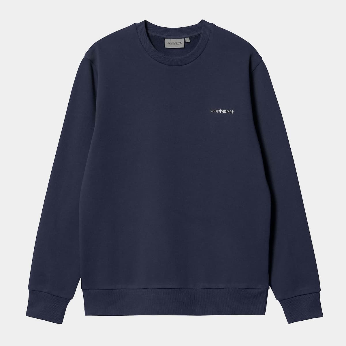Esta cómoda sudadera sin capucha de ajuste regular cuenta con lavado en prenda para mayor suavidad, cuello redondo, puños y cintura acanalados, junto con el logo de Carhartt en texto bordado en color blanco en el lado izquierdo del pecho.