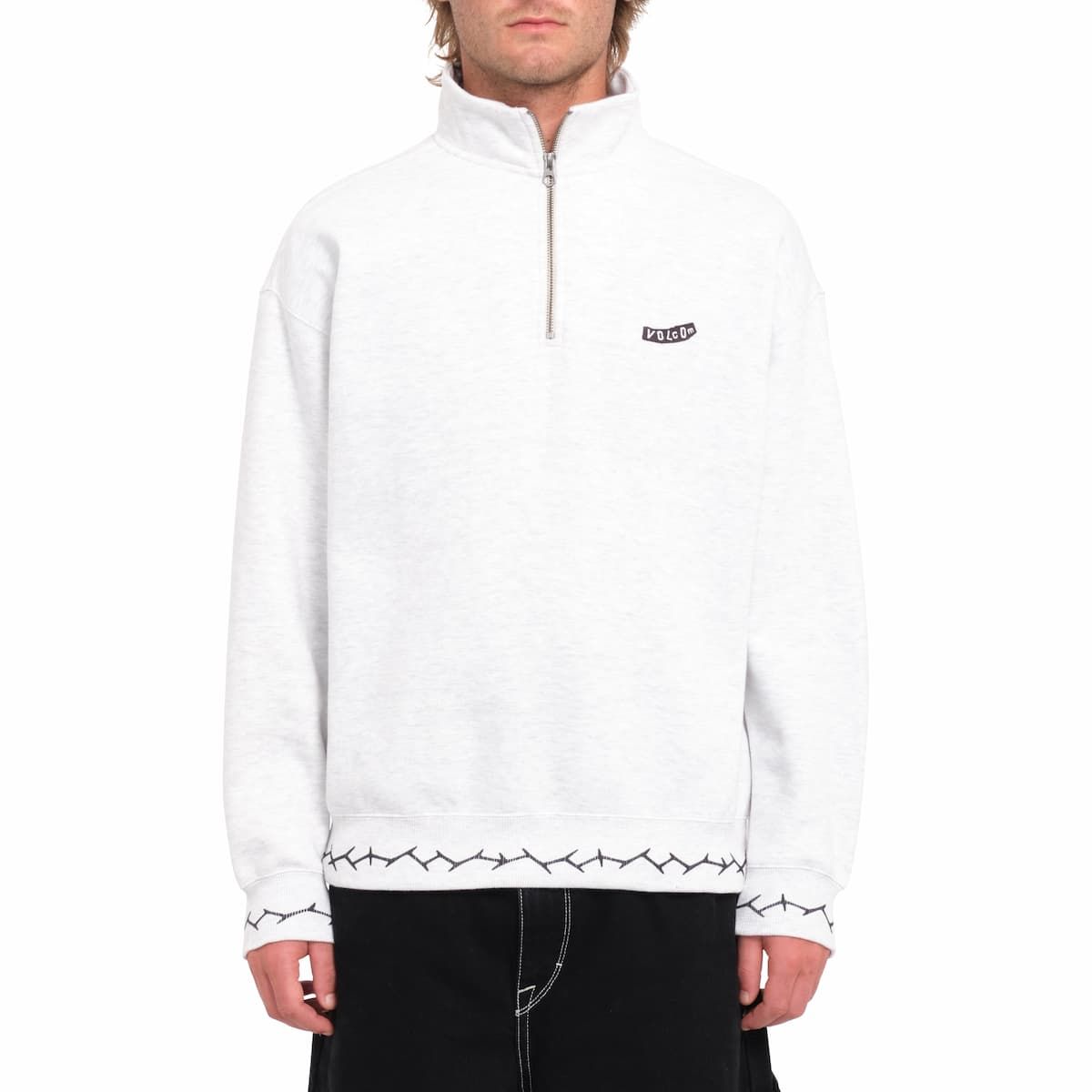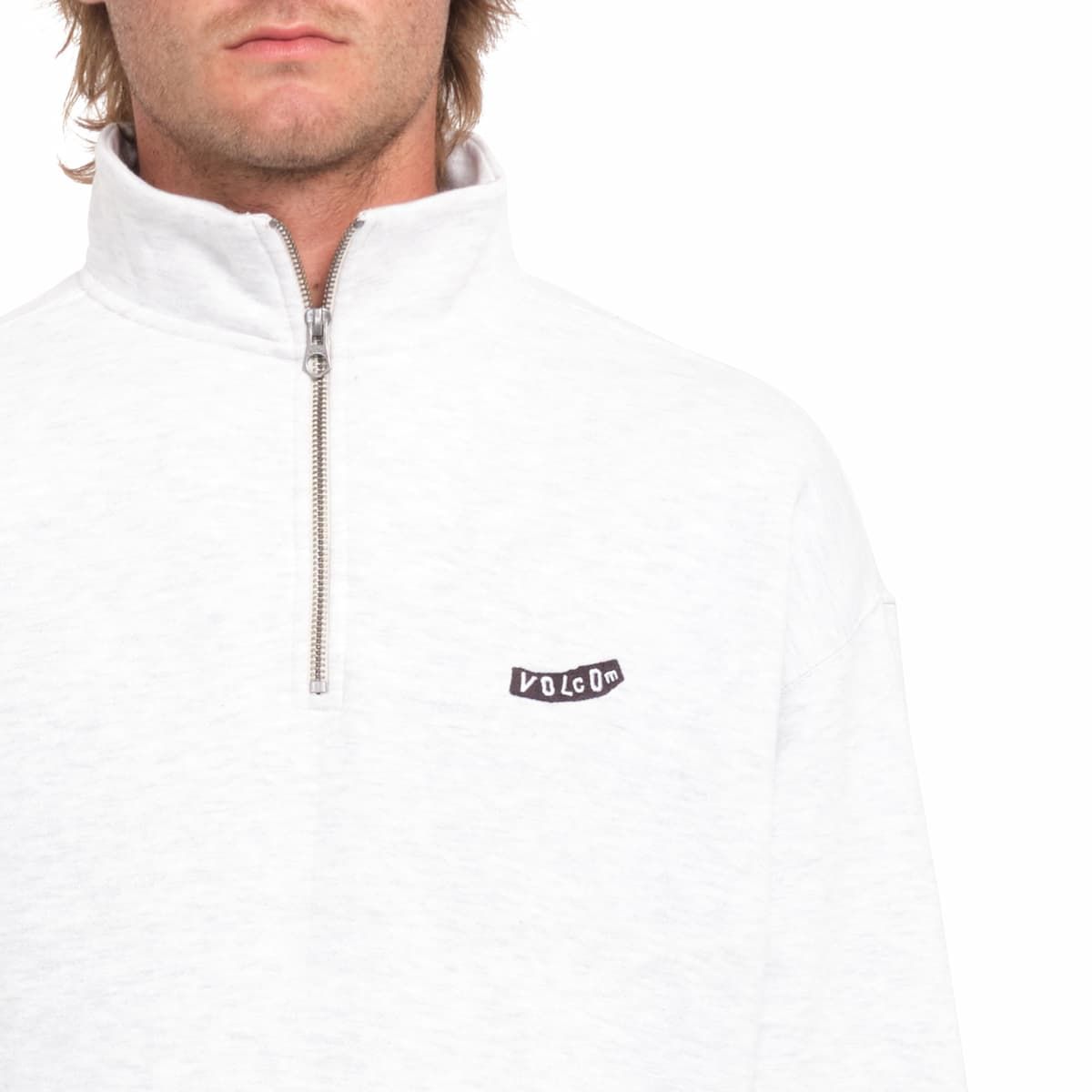 La sudadera con media cremallera para hombre Mocklov Crew en tono blanco hueso jaspeado (Bone Heather) de Volcom está confeccionada con suave tejido de 55% algodón, 30% poliéster y 15% poliéster reciclado (330g).
