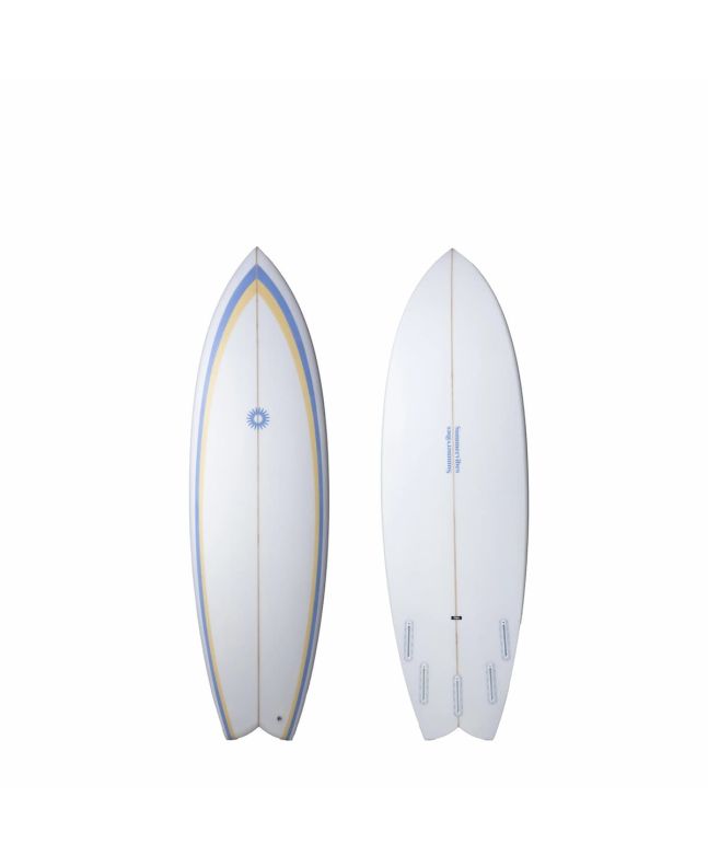 En blanco mate con líneas en azul pastel y amarillo crema, esta fish tiene un look limpio y nostálgico que no pasa desapercibido. El logo central, la línea de stringer visible y los acabados artesanales refuerzan su carácter único y surfero.