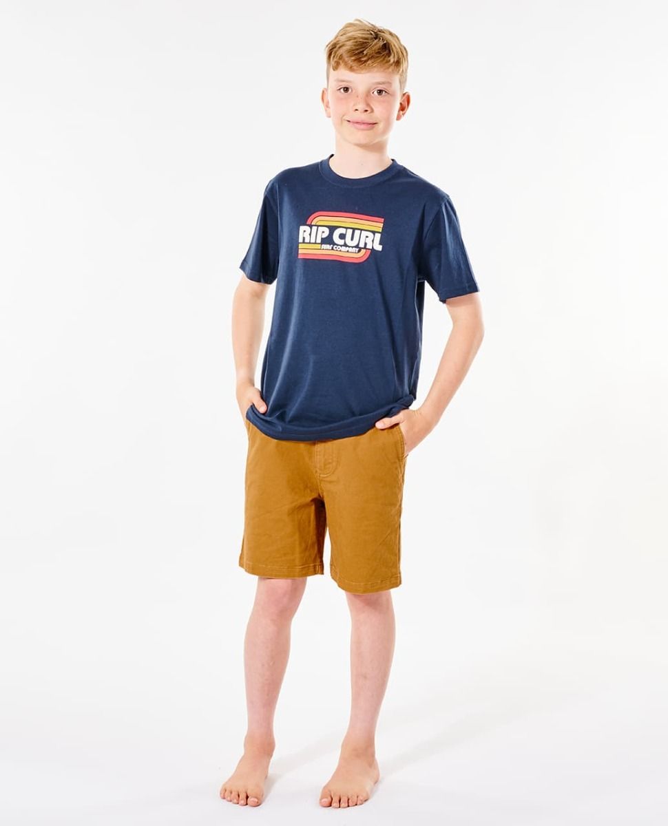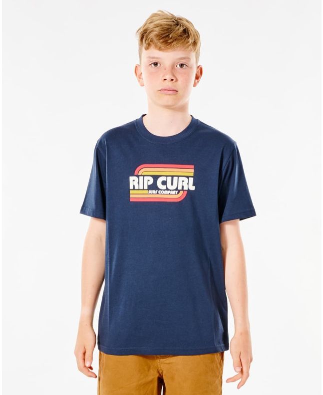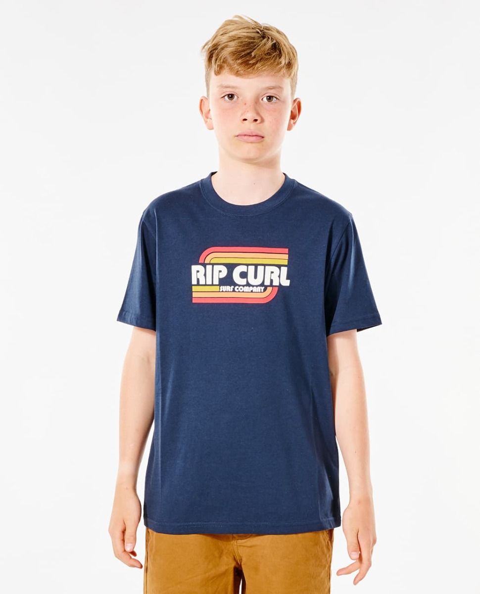Esta legendaria camiseta surfera infantil cuenta con ajuste estándar, cuello redondo, manga corta y el logo de Rip Curl estilo retro estampado en el pecho.