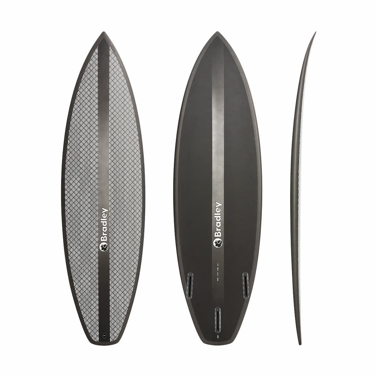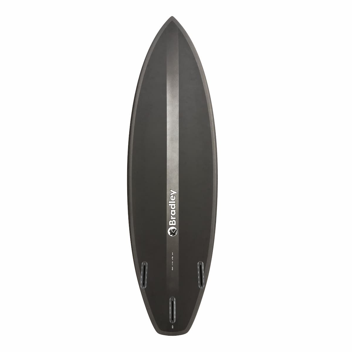 La tabla de surf Olympia LC6 Black 5'10" 28,4L negra tiene el logo de Bradley Surfboards estampado.