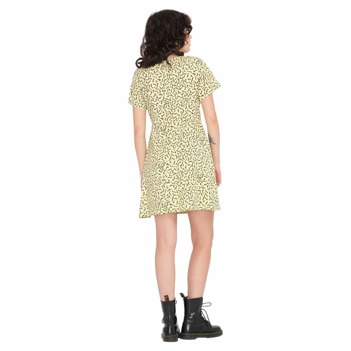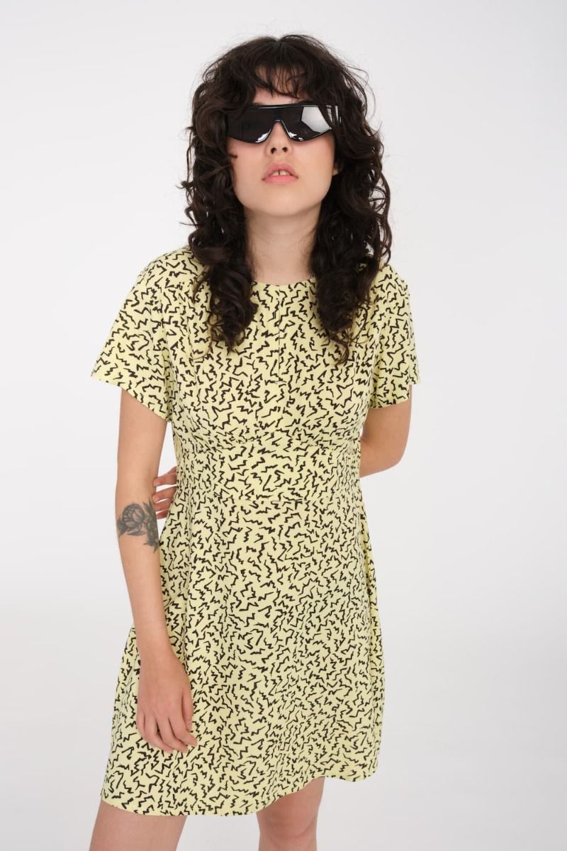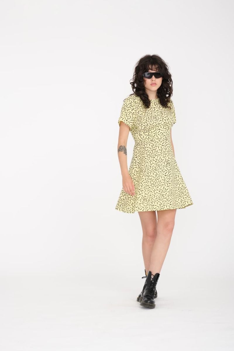 El vestido para mujer Surfpunk SS Dress en tono amarillo (Aura Yellow) con estampado de la Colección Asphalt Beach de Volcom está confeccionado con 100% viscosa (150g).