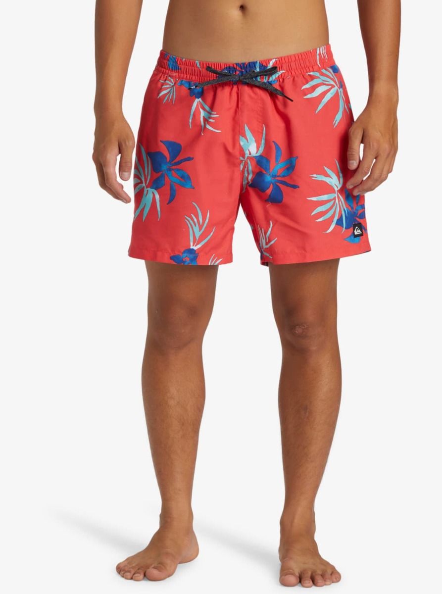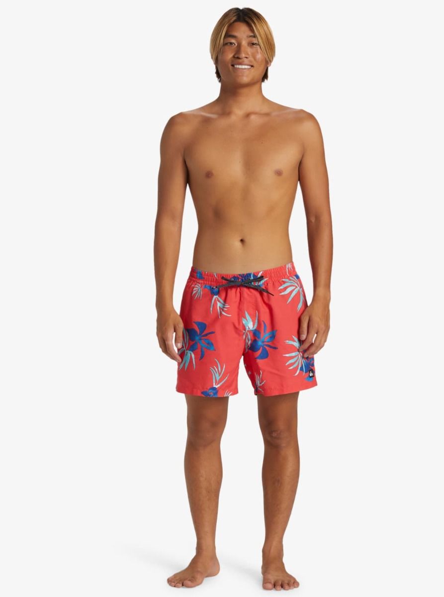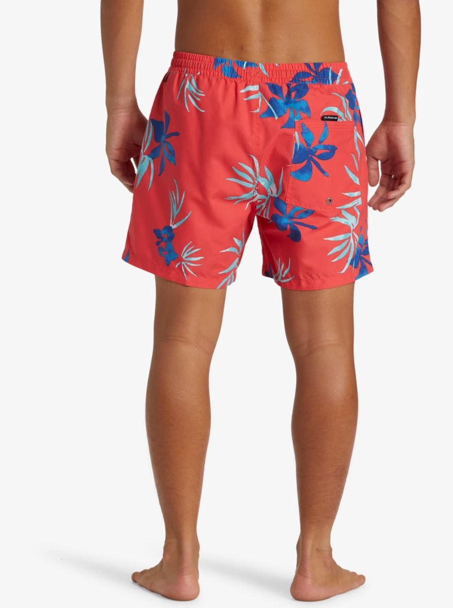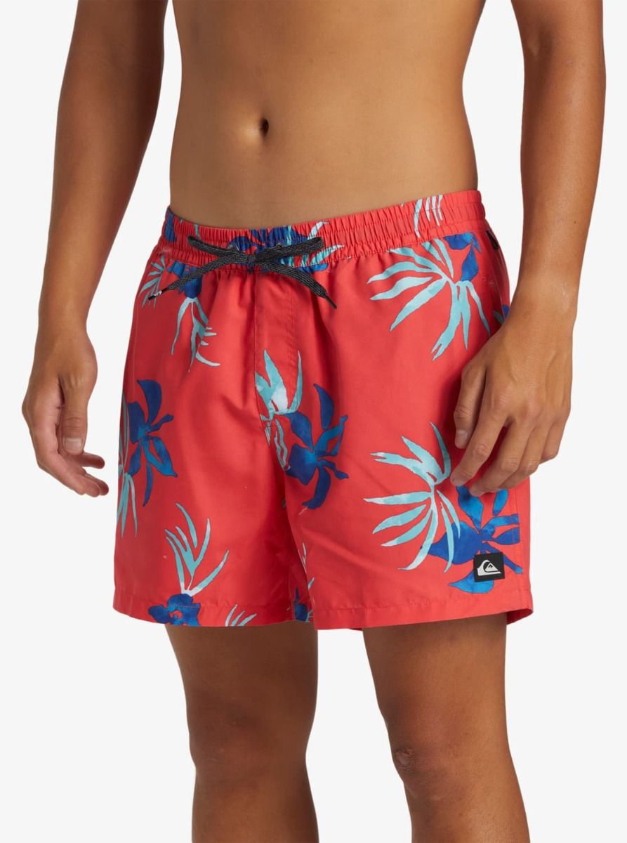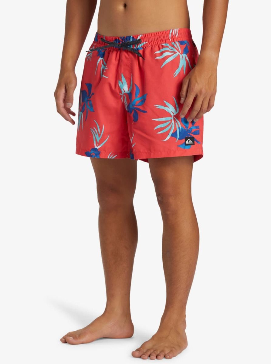 Este short de natación rojo floral, perteneciente a la Colección Everyday de Quiksilver, cuenta con revestimiento hidrofóbico sin PFC que repele el agua, calzoncillos interiores de malla, cintura elástica, cordón de ajuste, pierna recta, 38cm (15") de largo, bolsillos laterales de malla, bolsillo posterior de parche con cierre autoadherente de velcro y agujero de drenaje, un cordón elástico para las llaves y un parche de tela con el icónico logo de la ola y la montaña tejido en la pierna izquierda.