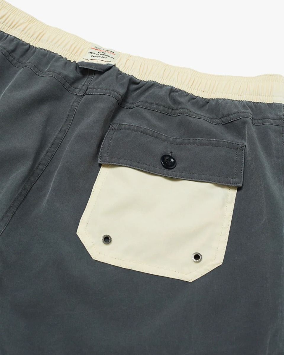 El bañador Sandbar Contrast Mesh 16" Gris para hombre tiene una etiqueta de garantía de Deus Ex Machina cosida en la cintura posterior.
