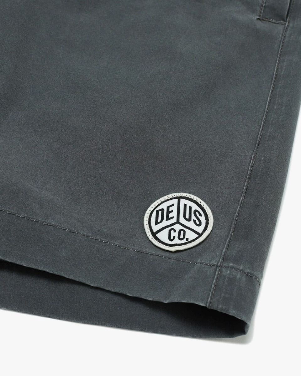 Este boardshort cuenta con 40cm de longitud (16"), cintura elástica ajustable mediante cordón, slip interior de malla, bolsillos laterales, bolsillo trasero con agujeros de drenaje, solapa, cierre de botón y cordón elástico para llaves, junto con un parche redondo de DEUS CO. bordado en la pierna izquierda.