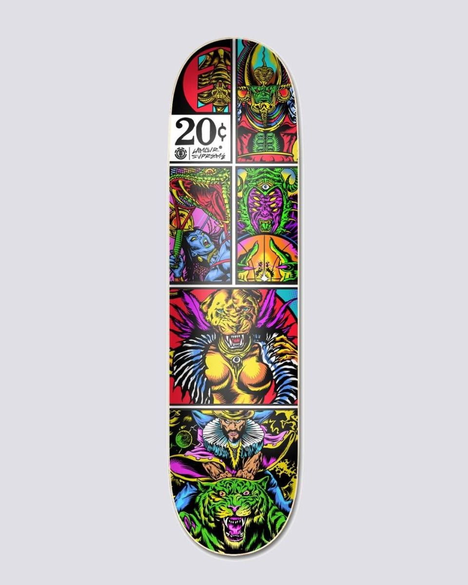 La tabla de skate L'Amour Supreme 8" Sakmet Nyjah tiene impresiones exclusivas de L’Amour Supreme y los logos de Element estampados.