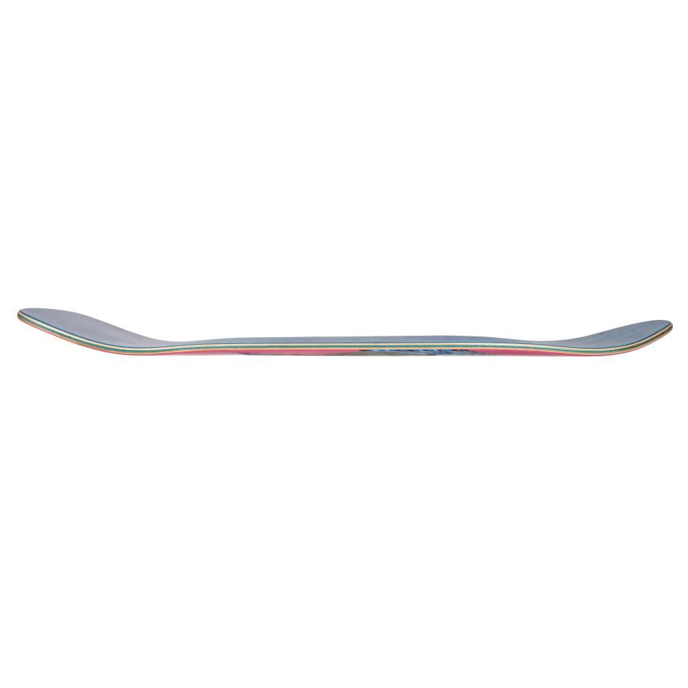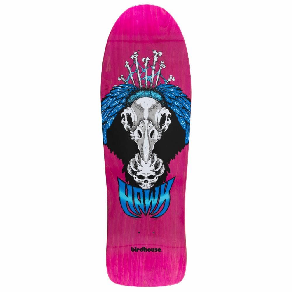 Esta tabla para monopatín, perteneciente a la Colección Old School de Birdhouse Skateboards y Tony Hawk, presenta shape y molde Hawk Old School, revestimiento superior azulado teñido con efecto manchado, impresión gráfica Birdhouse en la parte superior, así como bottom en intenso tono rosa fucsia con gráfico artístico Vulture.