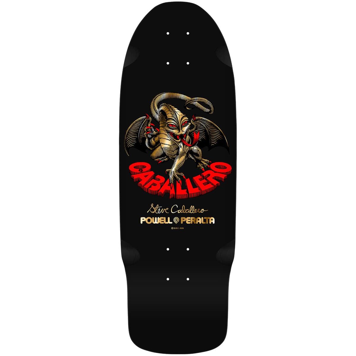 La tabla para monopatín Powell Peralta Bones Brigade Series 16 Steve Caballero 10.09" x 29.69" Negra combina el shape de Caballero en los años 80 con pintura satinada en color negro con detalles dorados, junto con gráficos originales de VCJ Vernon Courtlandt Johnson y el icónico logo del dragón de Caballero.