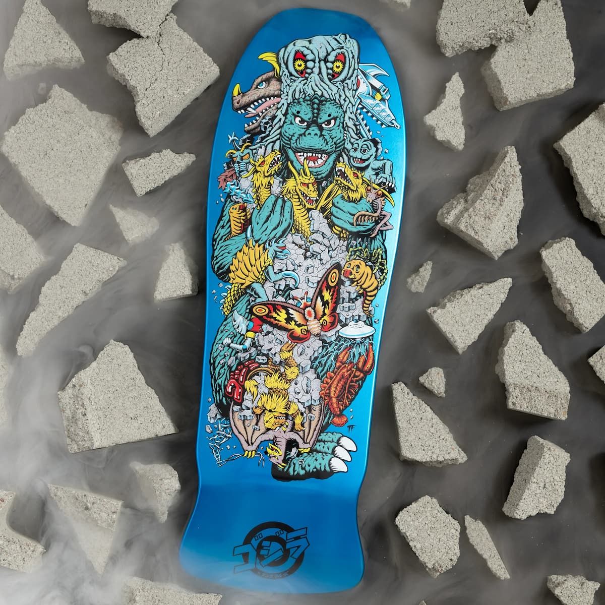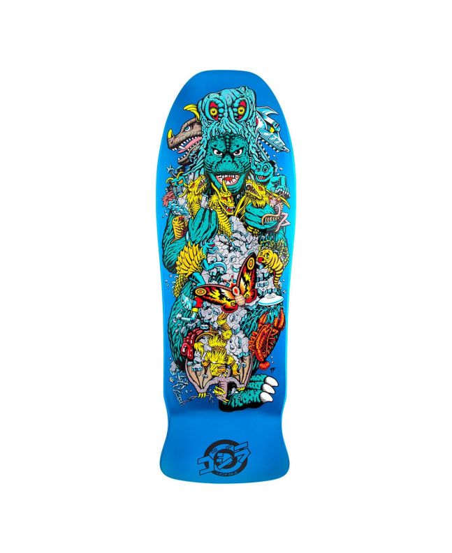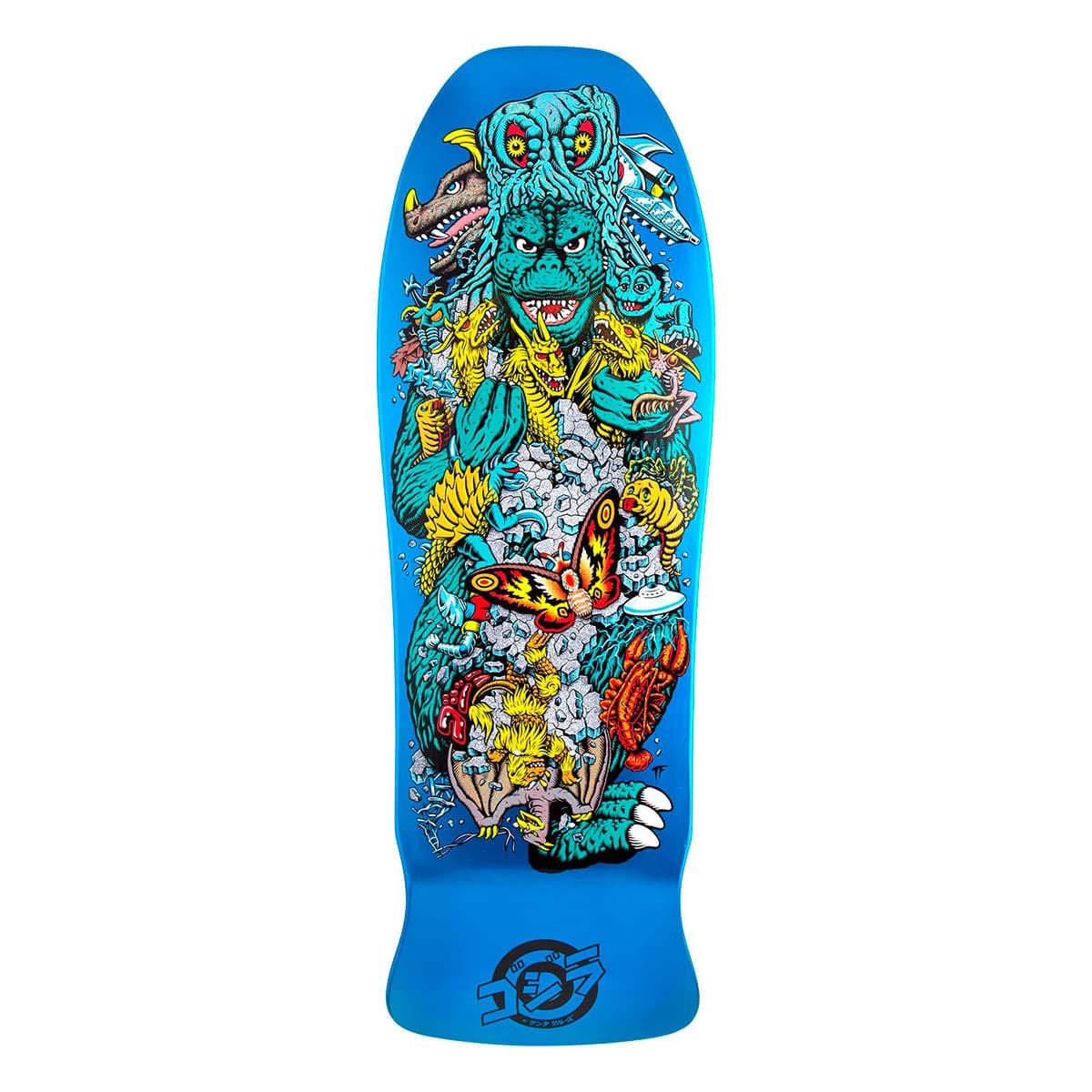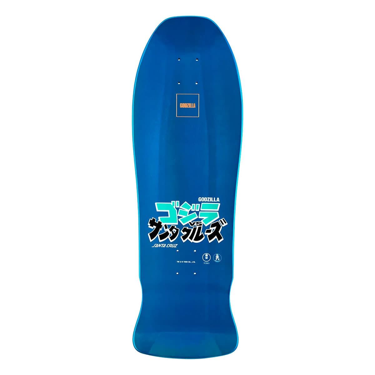 Esta tabla para monopatín de Edición Limitada, perteneciente a la exclusiva Colección Santa Cruz x Godzilla, cuenta con acabado azul metalizado, gráficos diseñados por Rob Roskopp de Godzilla y su ejército de Kaijus en la parte inferior del deck e ilustraciones Godzilla vs Santa Cruz junto con el logo de Godzilla grabado con láser en la parte superior.