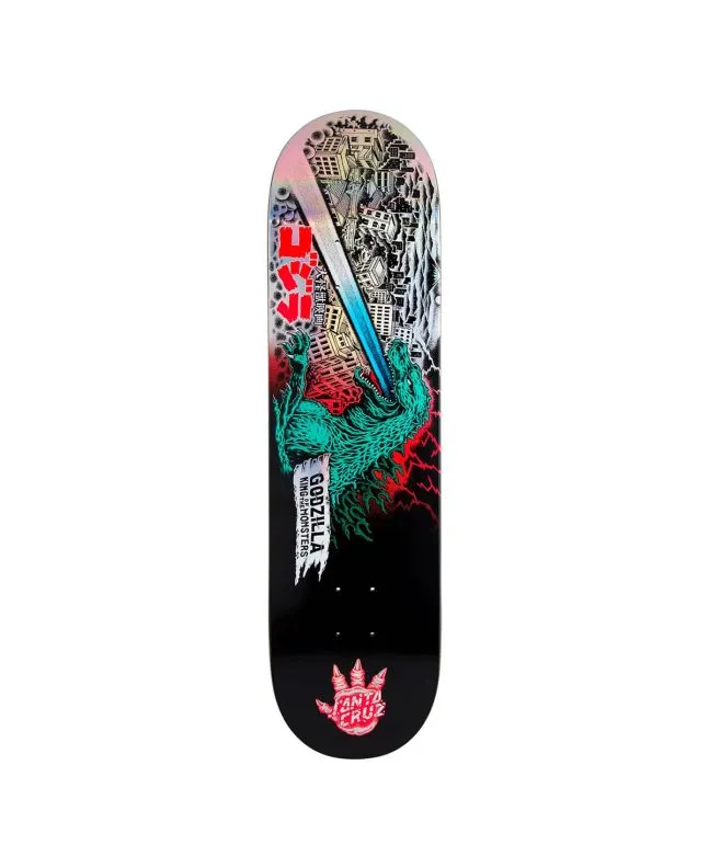 Esta tabla para monopatín de Edición Limitada, perteneciente a la Colección Santa Cruz x Godzilla, cuenta con un exclusivo gráfico de Godzilla "Rey de los Monstruos" atacando la ciudad con acabado brillante, mientras que en la parte superior tiene el logo de Godzilla grabado con láser e ilustraciones Godzilla vs Santa Cruz.