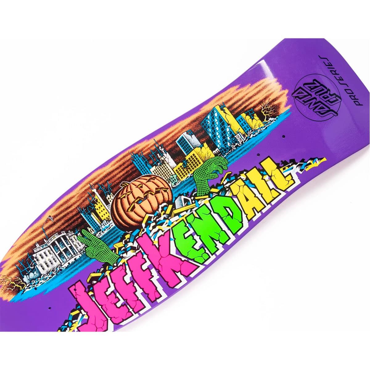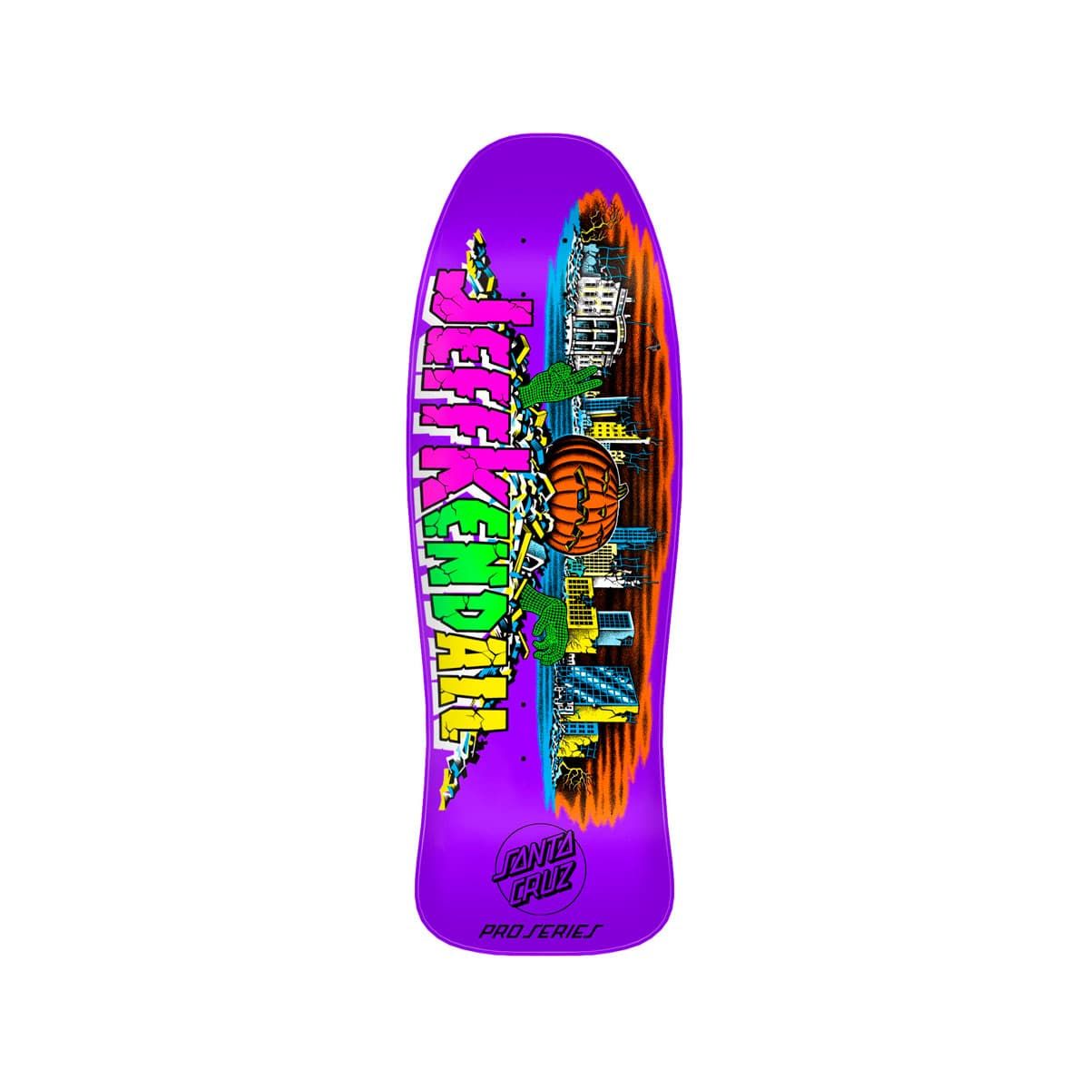 Tabla de skate Santa Cruz Kendall Pumpkin Reissue 10.0 en púrpura mate, con shape old school, cóncavo Cruz Missile II y gráfico icónico de Jim Phillips.