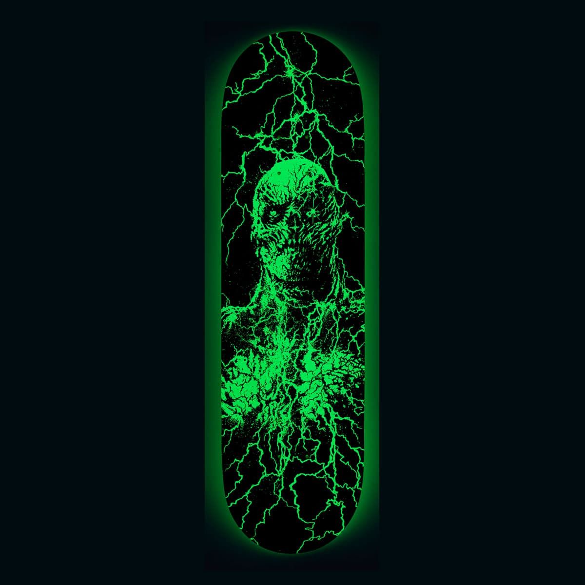El arte, de estética eléctrica y oscura, reproduce la silueta de Vecna envuelta en relámpagos verdes sobre una superficie que resplandece al apagarse la luz. Un tributo visual brutal que une el universo del skate con la energía sobrenatural de Stranger Things.