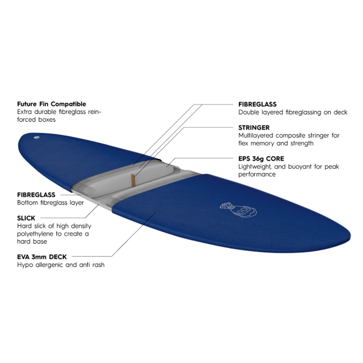 Esta mid-length híbrida One Bad Egg 7'0" azulada de Mark Phipps cuenta con una capa de fibra de vidrio en el bottom, deck con doble capa de fibra de vidrio y EVA de 3mm hipoalergénica y anti-sarpullidos, slick duro de polietileno de alta densidad para crear una base dura, stringer multicapa para una mejor memoria de flexión y resistencia, núcleo EPS de 36g ligero y boyante para un máximo rendimiento, cajetines reforzados con fibra de vidrio extraduradera y configuración 2+1 con quillas laterales Futures.