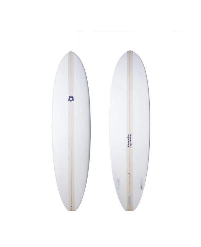 Como el resto de la gama Mini Mal de Summer Vibes, esta funboard luce un acabado blanco mate con banda central beige, stringer visible y un logo sutil en azul oscuro. Una imagen limpia y elegante que transmite el surf en su forma más pura.