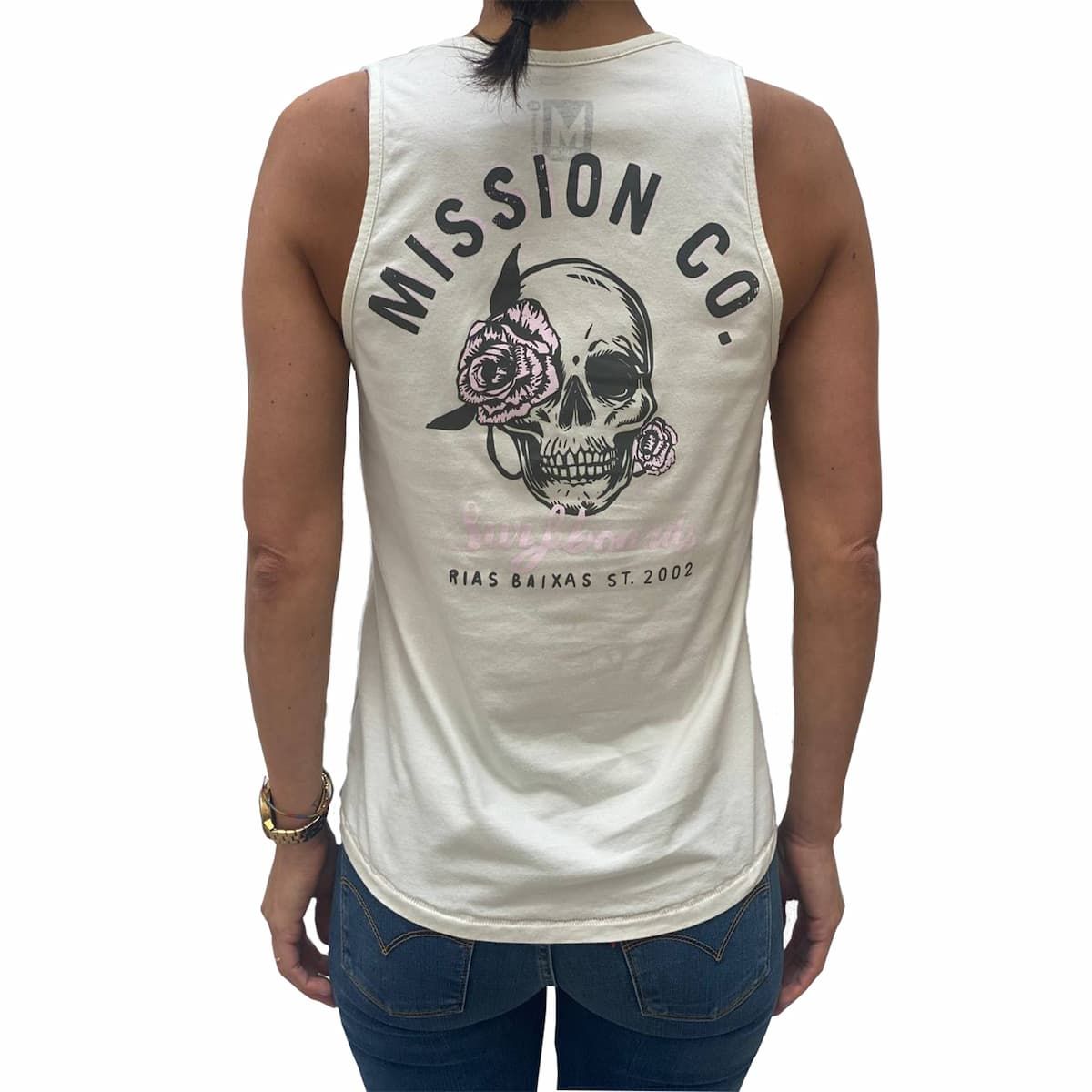 Esta camiseta de tirantes de corte normal cuenta con cuello redondo, estampado original Mission con una calavera y una rosa en el lado izquierdo del pecho y en la espalda, así como la leyenda "Mission Co. Surfboards. Rías Baixas ST. 2002" serigrafiada en la espalda.