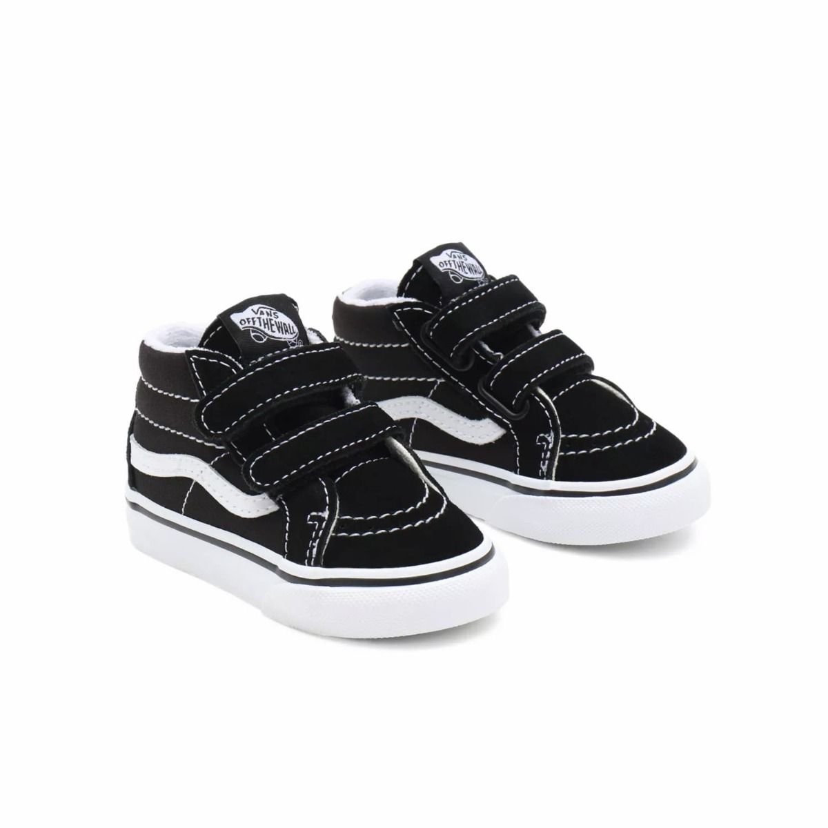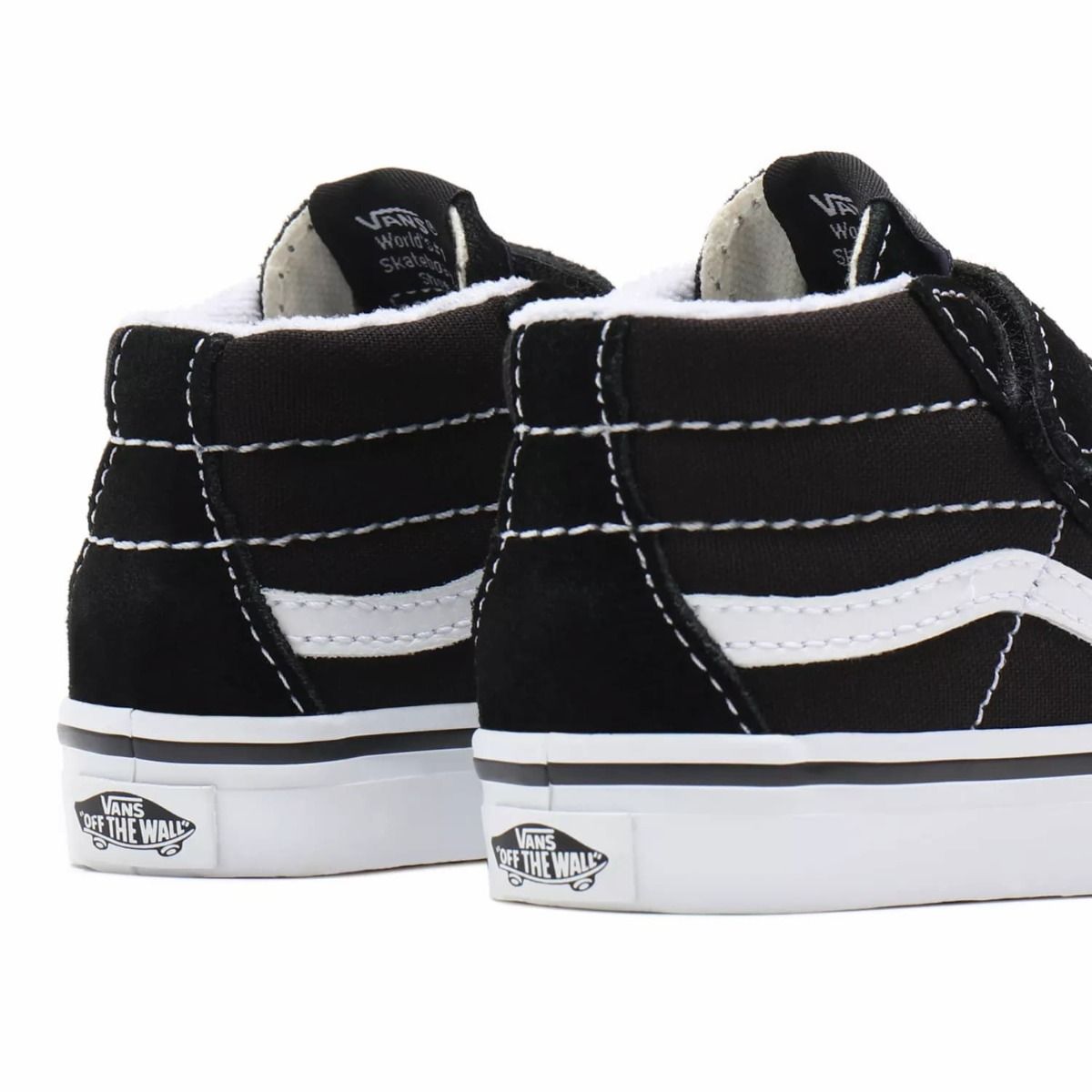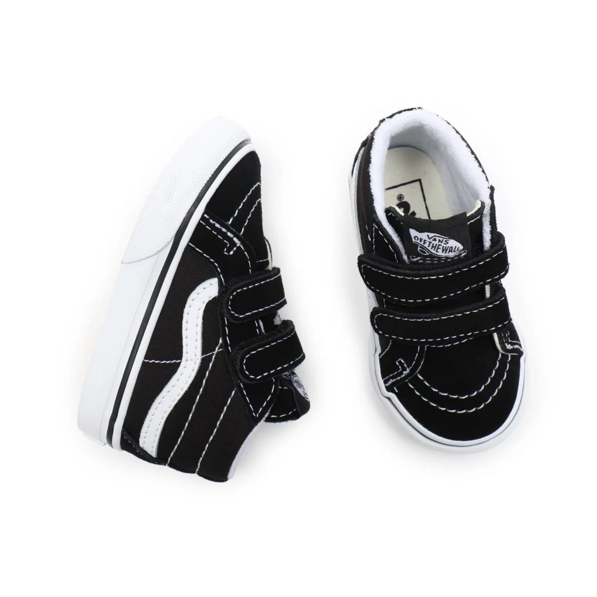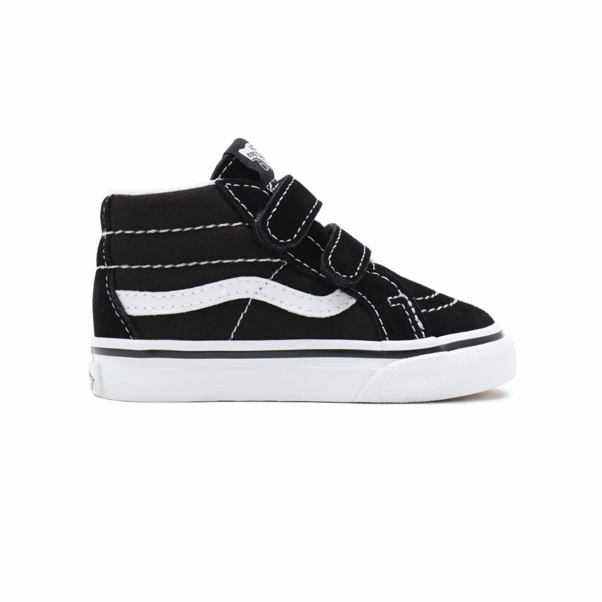 Las Zapatillas para bebés de entre 1 y 4 años Sk8-Mid Reissue V negras tienen una etiqueta de garantía "Vans Off The Wall" cosida en la lengüeta.