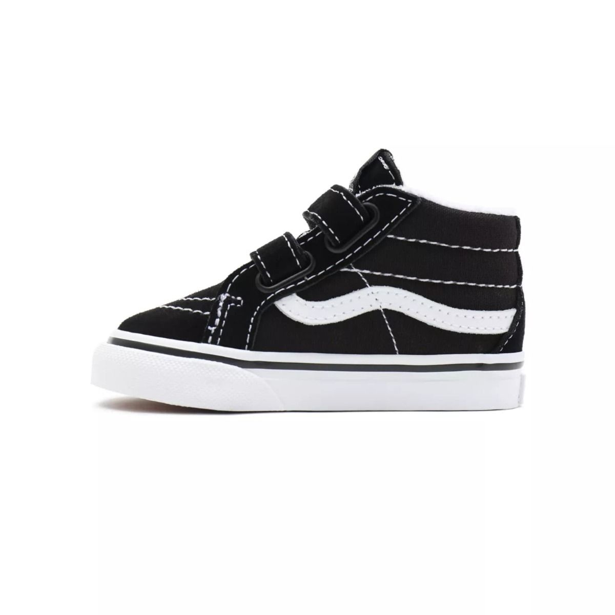 Las Zapatillas para bebé Sk8-Mid Reissue V negras con banda lateral sidestripe blanca (Black-True White) de Vans han sido fabricadas con ante, lona y caucho.