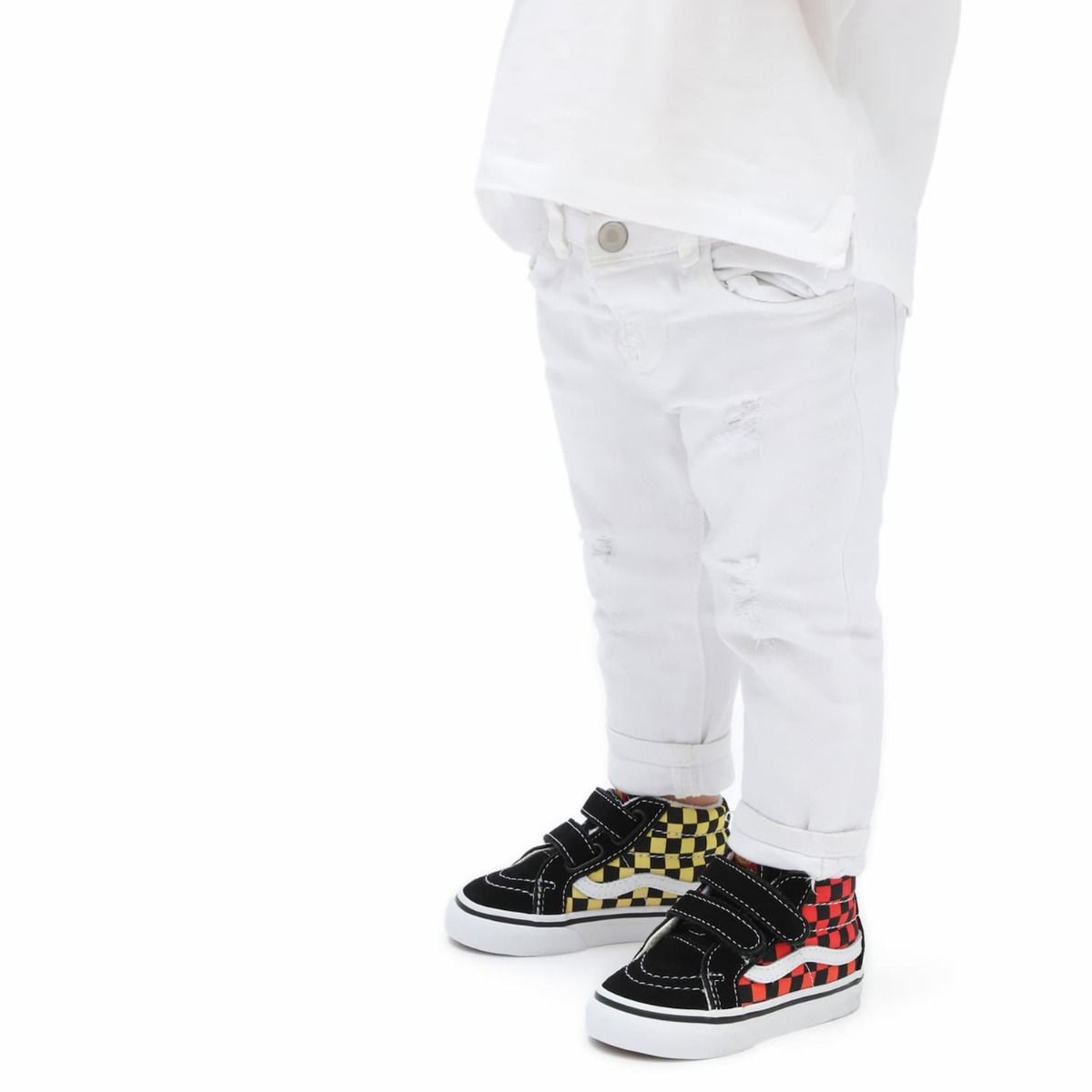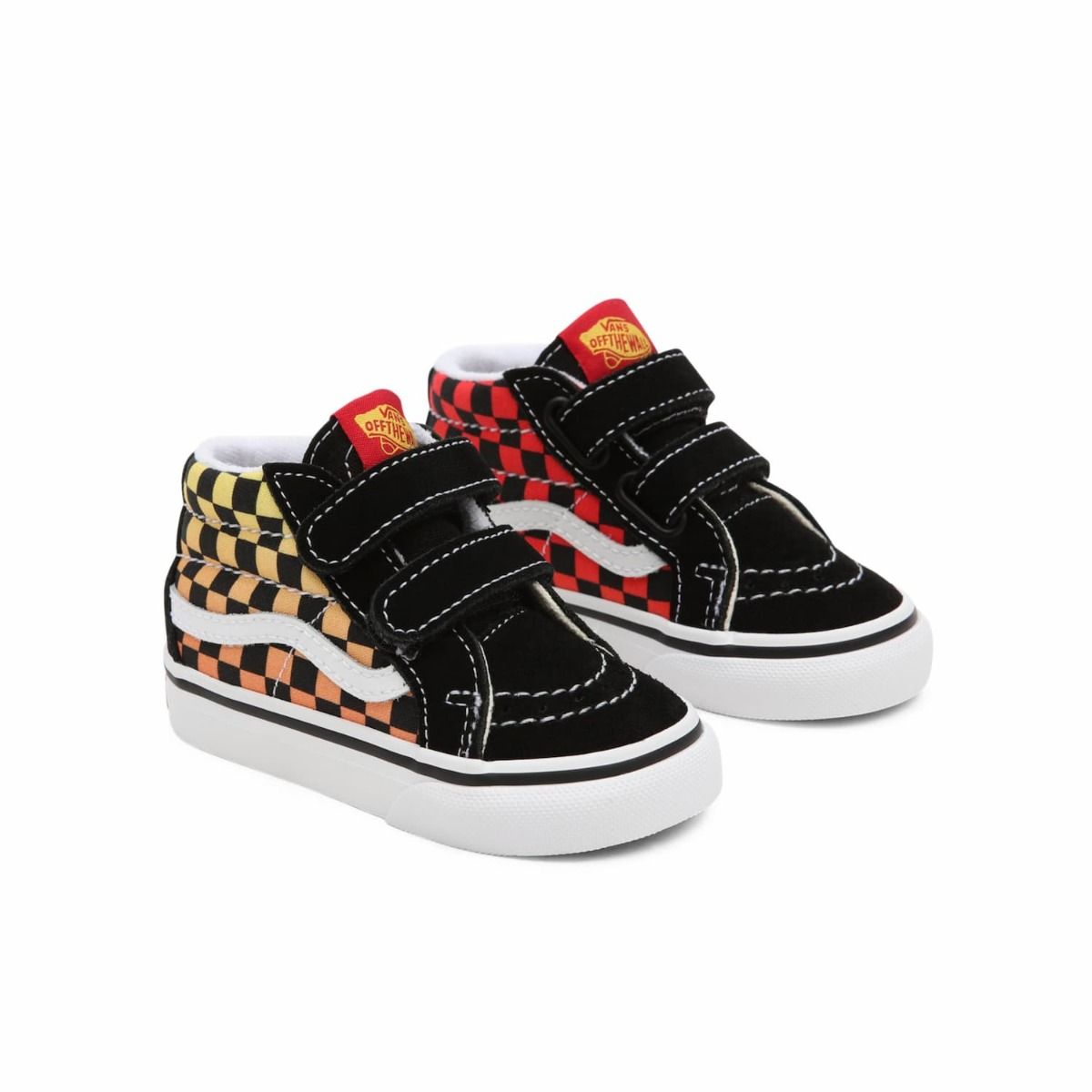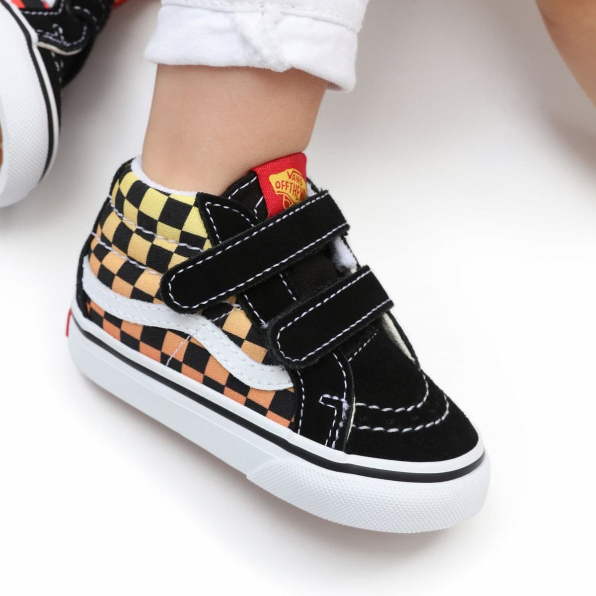 Estas zapatillas de media caña para niños de 1 a 4 años están inspiradas en las legendarias Sk8-Hi de Vans y cuentan con pala de ante y lona resistente, cierre doble de velcro, cuello acolchado, refuerzos en la puntera, estampado Checkerboard degradado en los laterales, banda lateral sidestripe blanca y la distintiva suela waffle de Vans para ofrecerte un agarre más firme, mayor comodidad, sujeción y flexibilidad.