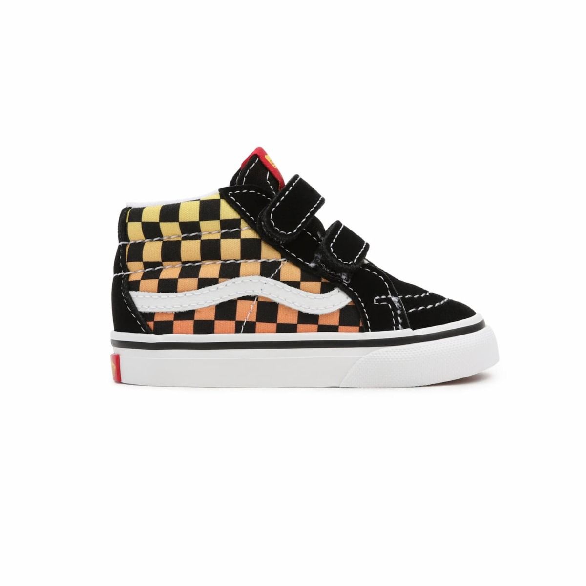 Las Zapatillas para bebé Sk8-Mid Reissue V Flame Logo Repeat de Vans negras con banda lateral blanca (Black-Multi) han sido fabricadas con ante, lona y caucho.