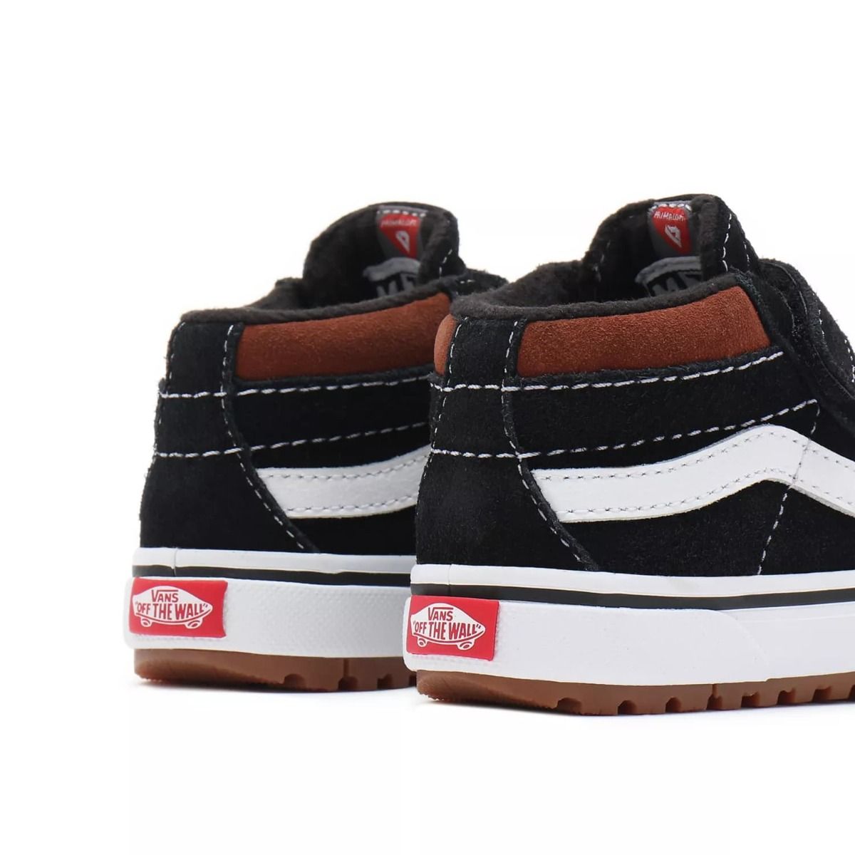 Las zapatillas TD SK8-Mid Reissue V MTE-1 negras para bebé tienen una etiqueta de Vans Off the Wall cosida en la lengüeta.