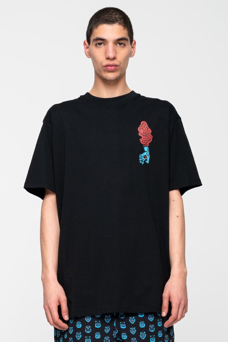 La camiseta de manga corta para hombre Speed Wheels Scream negra tiene una etiqueta de garantía Santa Cruz Skateboards en el cuello interior.