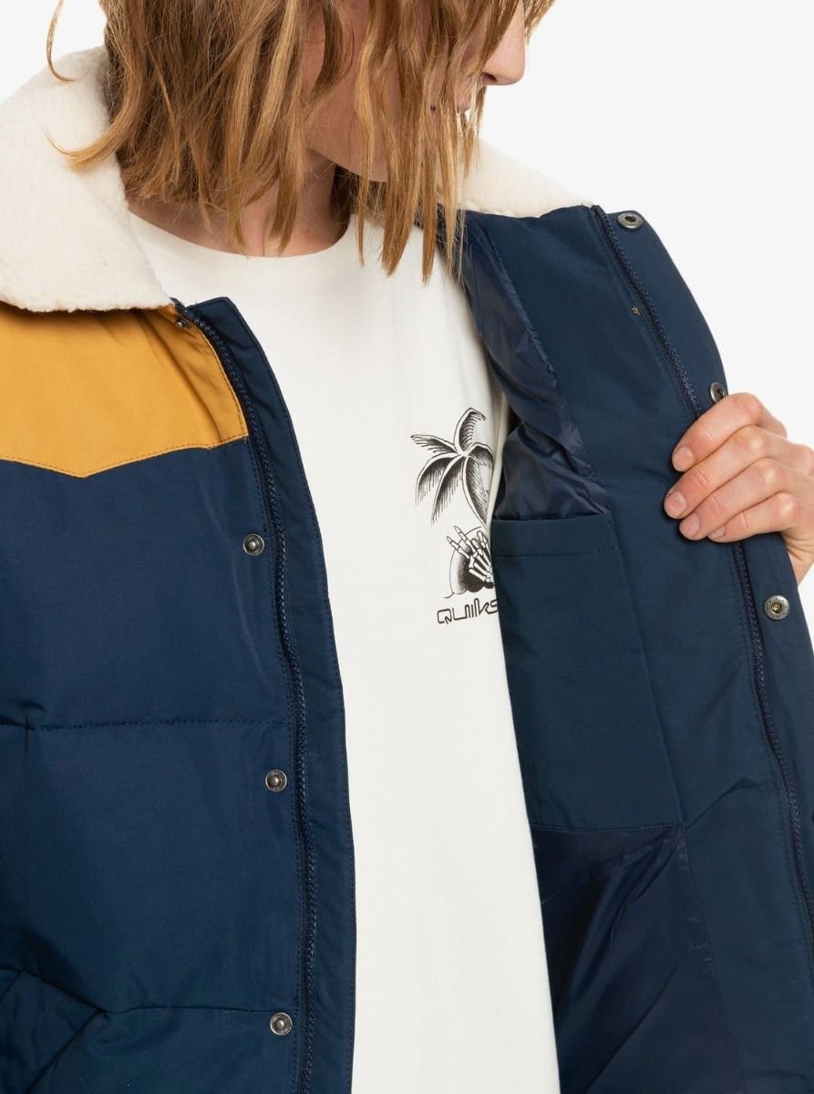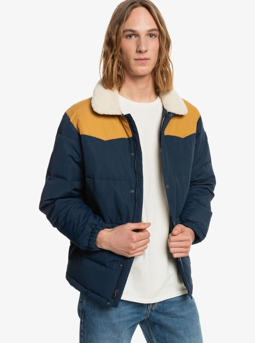 Esta chaqueta acolchada de corte normal, clásico y cómodo, cuenta con tejido interior de tafetán, cuello con tejido interior Sherpa, bolsillos con entrada con corchete, cierre de cremallera en la parte frontal, acabado semi elástico en puños y bajos y parche de tela en la manga mezcla de algodón y nailon con el logo de Quiksilver.