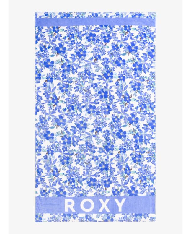 Toalla Roxy en azul con flores sobre fondo blanco hueso. Perfecta para la playa o la piscina, con tacto suave y secado eficaz.