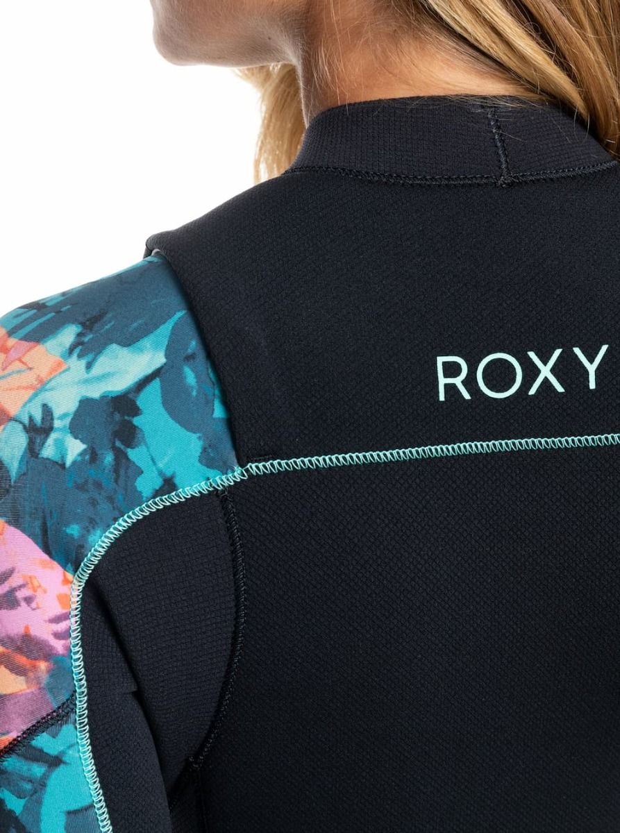 El traje de neopreno para mujer 4/3mm Elite Chest Zip de Roxy en negro antracita con detalles de hojas en las mangas (Anthracite Leaf) está confeccionado con tejido Eco XtraStretch fabricado a base de desechos de neumáticos, con certificado Bluesign® y mayor capacidad térmica y confort sin sacrificar flexibilidad.