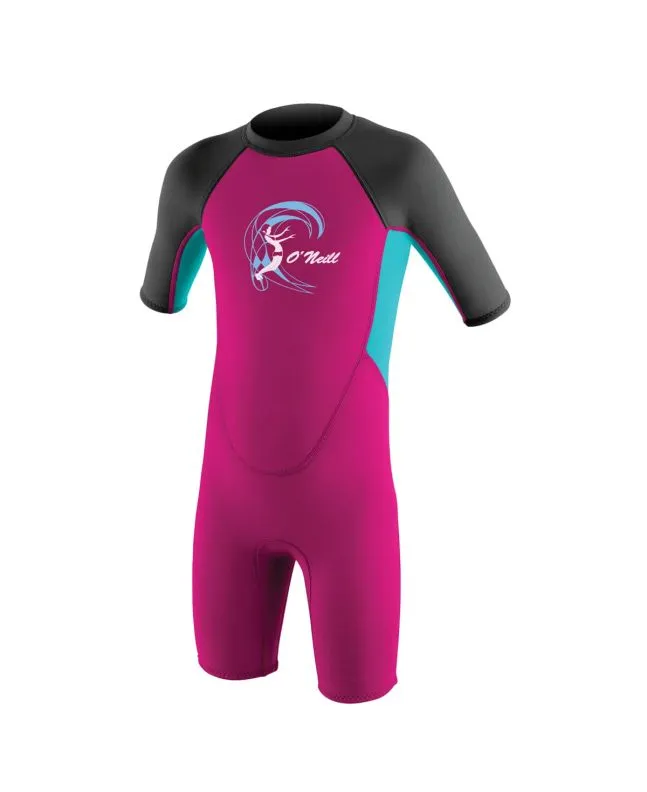 Traje de surf de primavera con manga corta y cremallera en la espalda O'Neill Toddler Reactor II 2mm en color fucsia, aguamarina y grafito para niña (1-6 años)