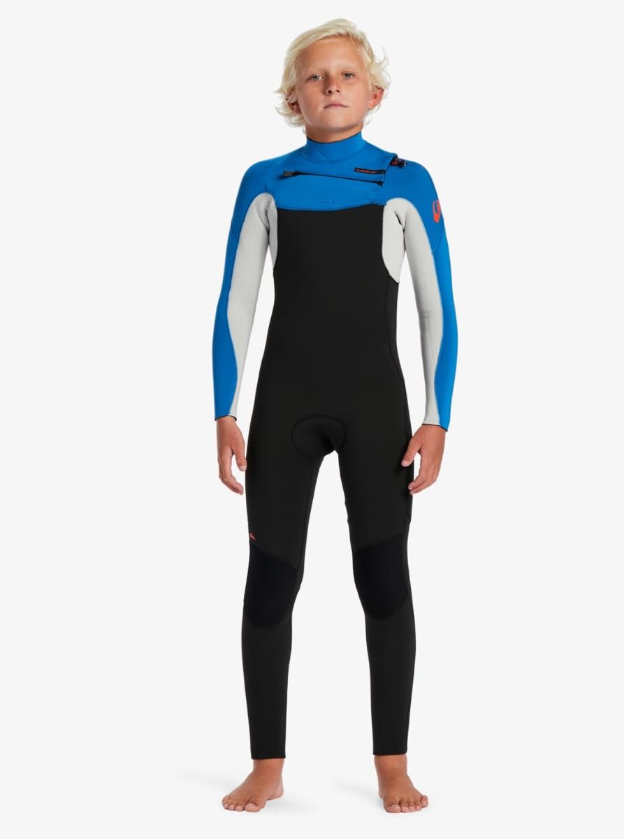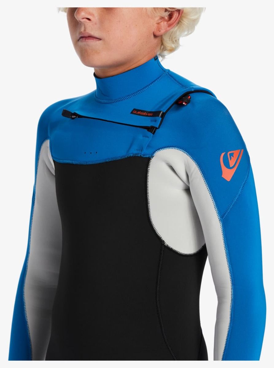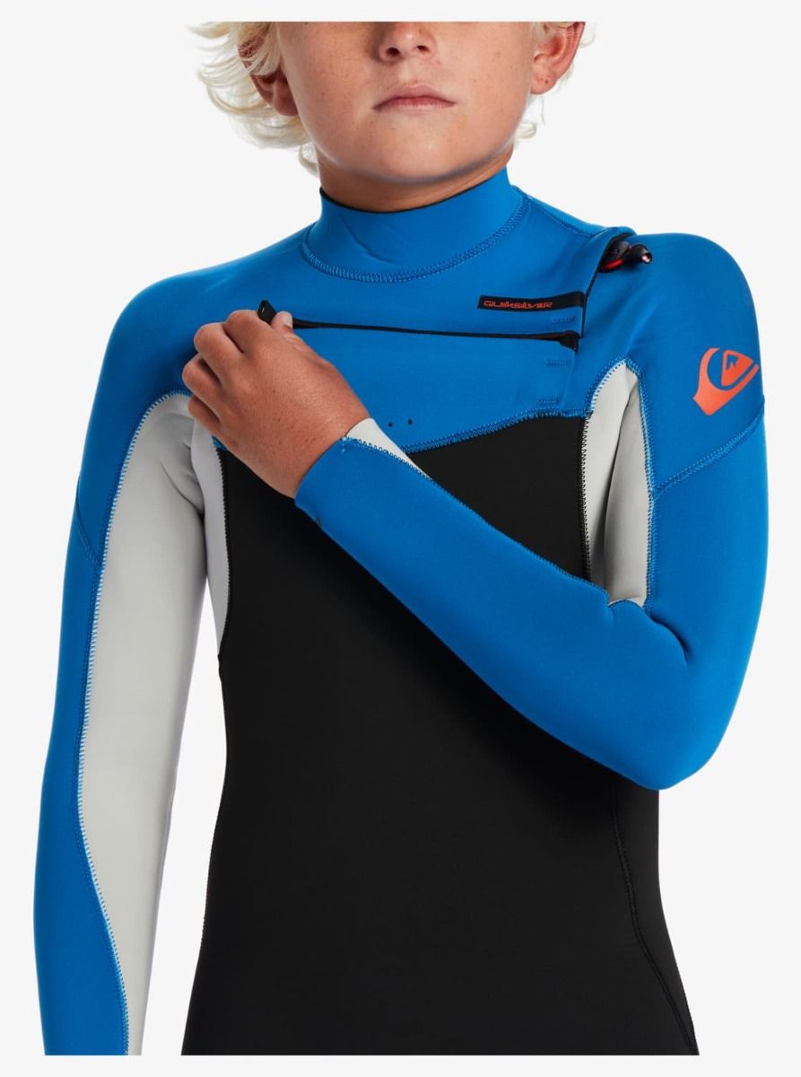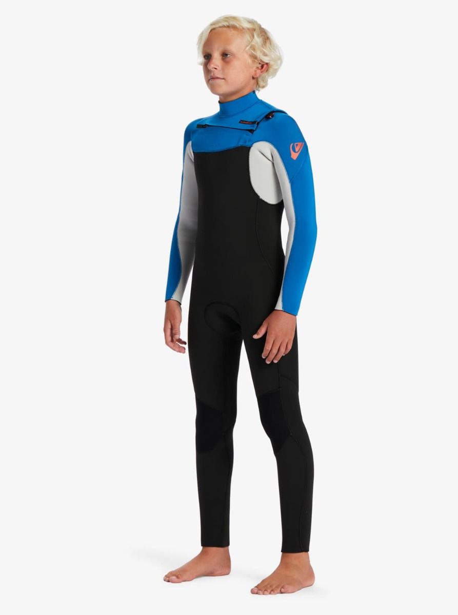 El traje de surf con cremallera en el pecho para niños de entre 8 y 16 años 4/3mm Everyday Sessions Boy Chest Zip de Quiksilver en tono negro, gris y azul (Black-Squale Blue) está confeccionado con neopreno ecológico Stretchflight ECO para lograr calor y comodidad sin renunciar a la flexibilidad.