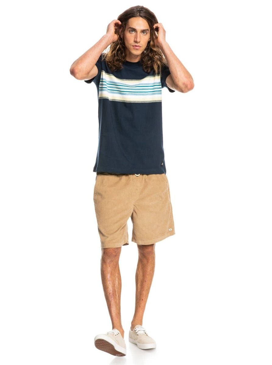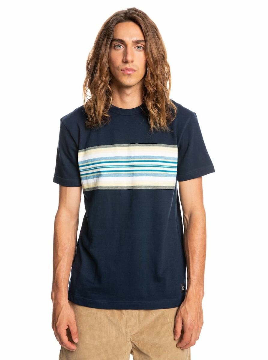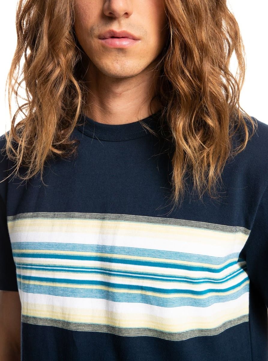 Esta camiseta de corte clásico cuenta con cuello redondo acanalado, manga corta, estampado a rayas teñidas en hilo en el pecho y una etiqueta con el logo de Quiksilver cosida en la parte inferior frontal.