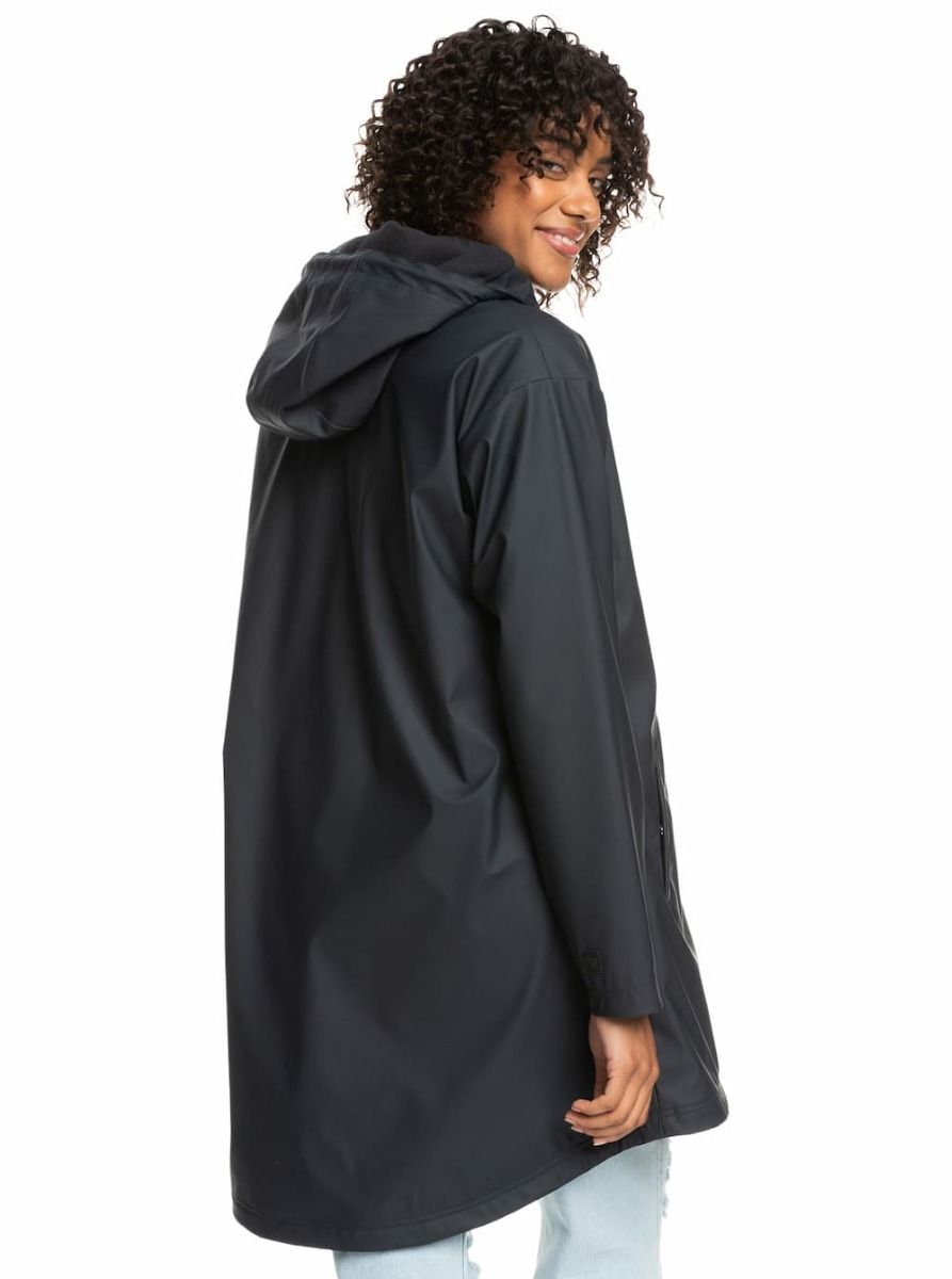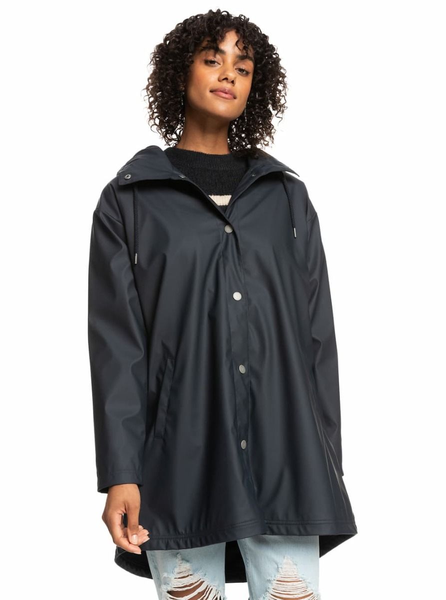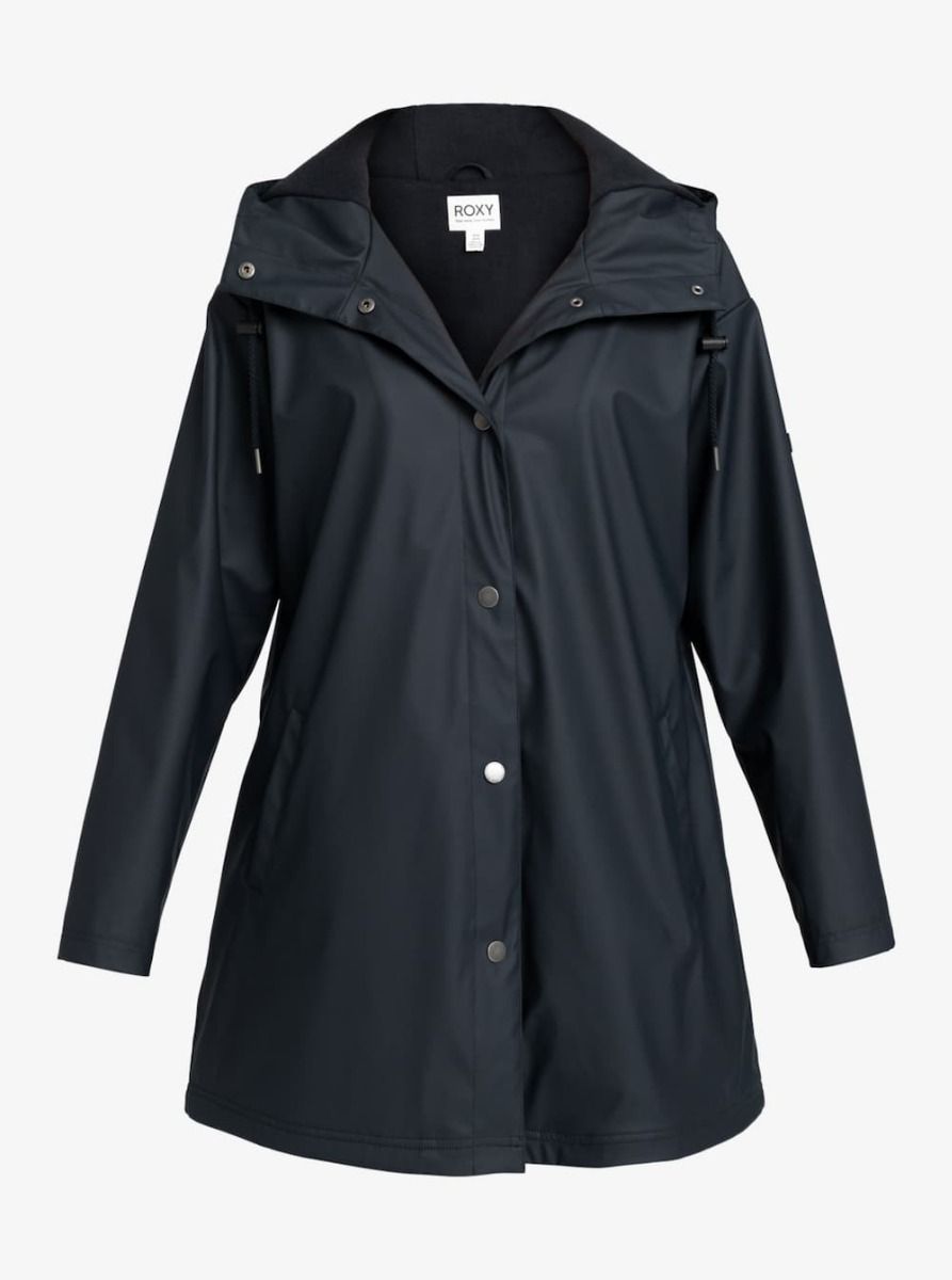 Este impermeable para mujer de largo hasta la mitad del muslo cuenta capucha reforzada y ajustable, cierre frontal de botones a presión, forro interior polar, bolsillos laterales con cremallera y un parche ROXY de silicona cosido en las mangas.