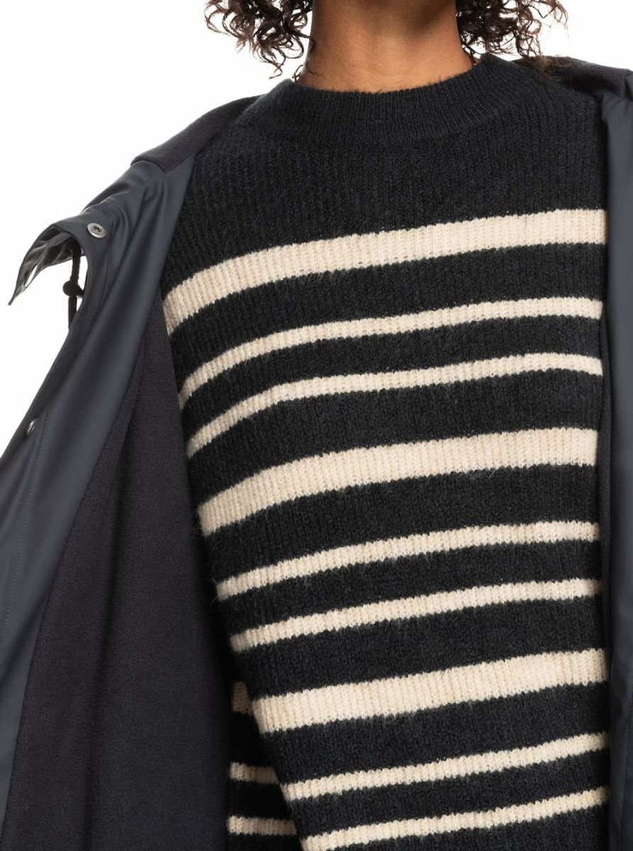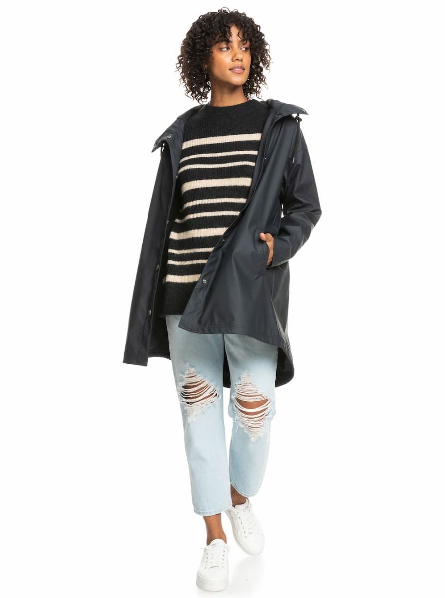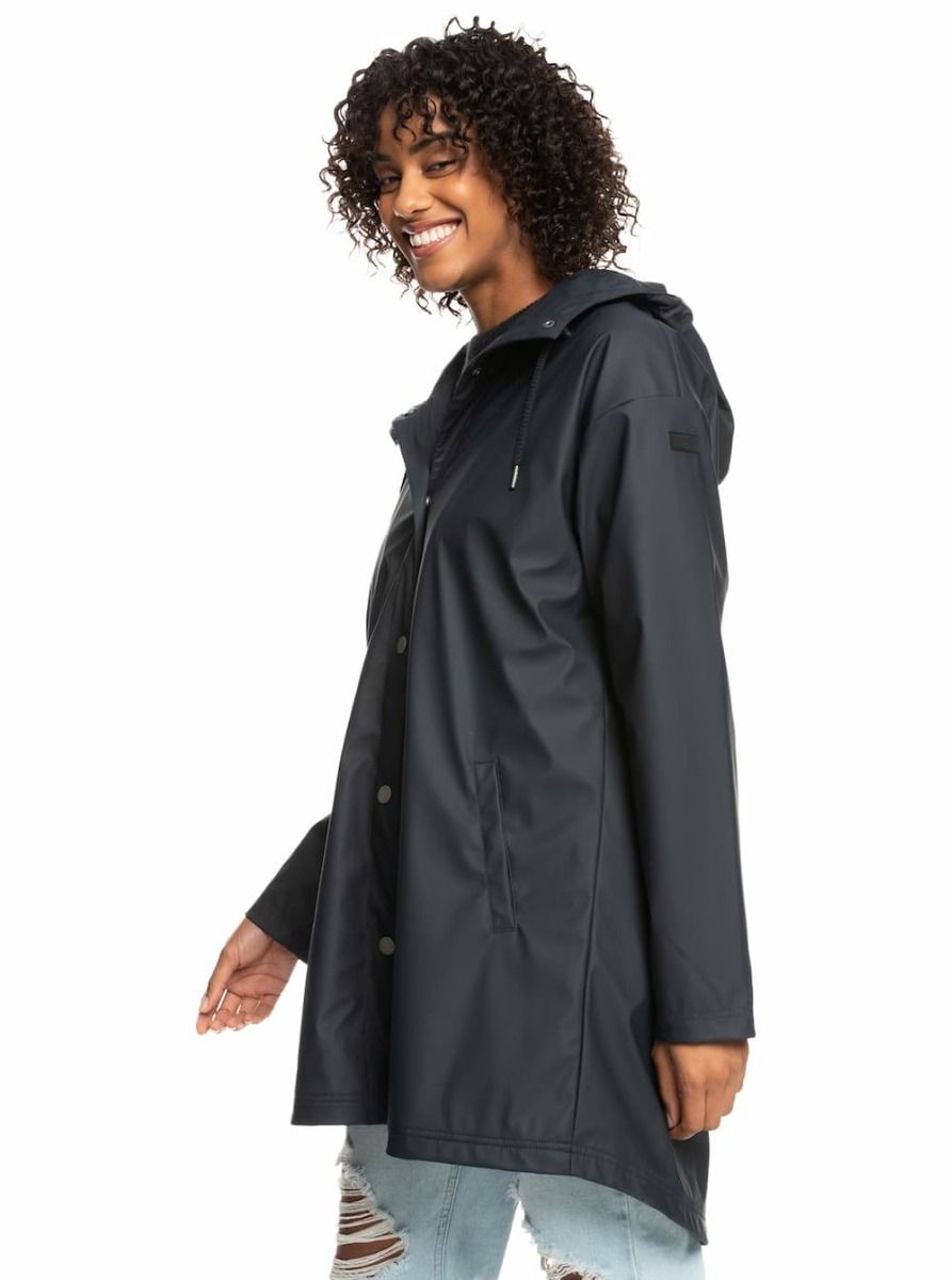 Este impermeable para mujer de largo hasta la mitad del muslo cuenta capucha reforzada y ajustable, cierre frontal de botones a presión, forro interior polar, bolsillos laterales con cremallera y un parche ROXY de silicona cosido en las mangas.